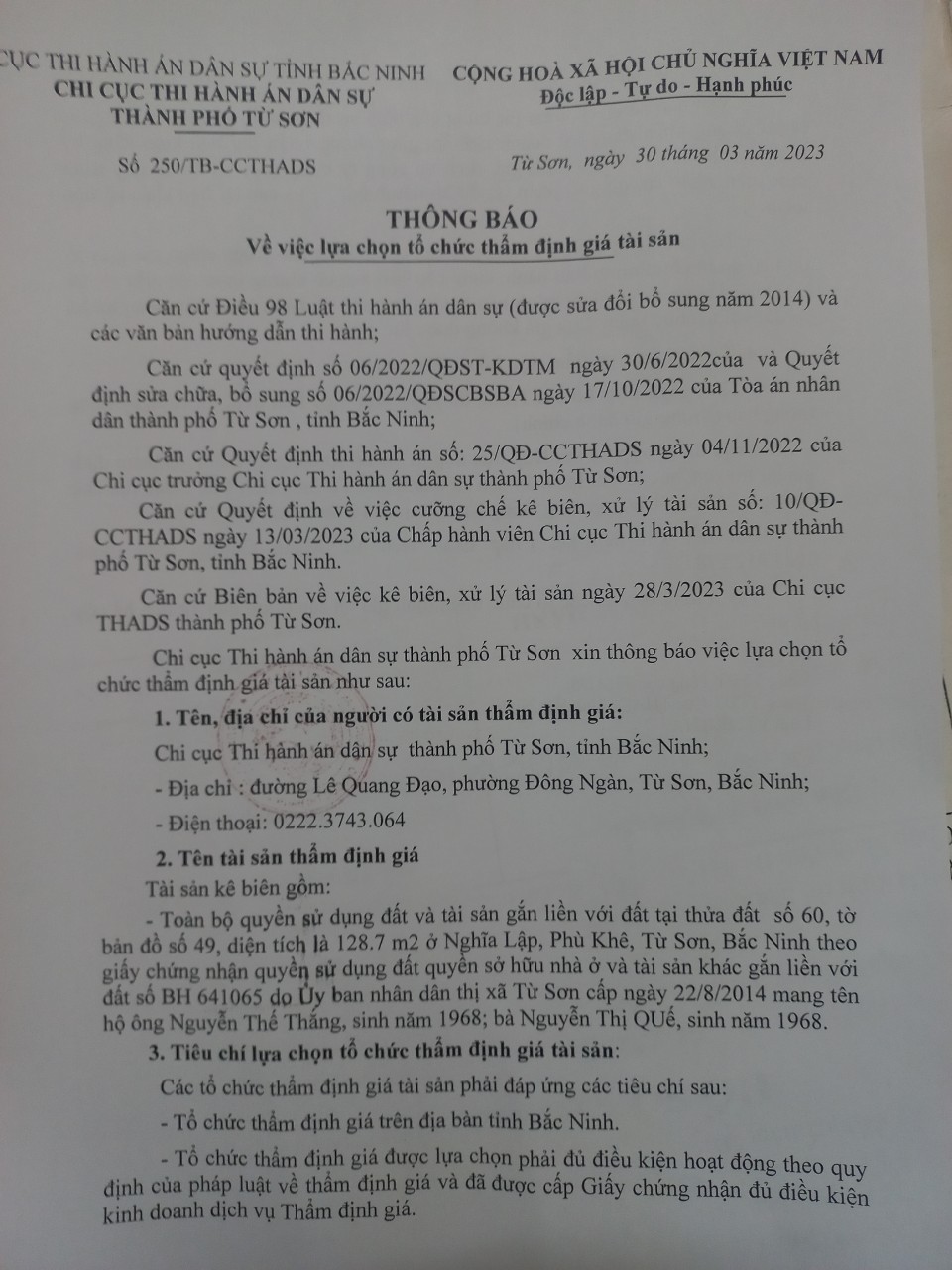 Chi cục THADS thành phố Từ Sơn, tỉnh Bắc NInh Thông báo lựa chọn tổ chức thẩm định giá tài sản số 250/TB-CCTHADS ngày 30/3/2023