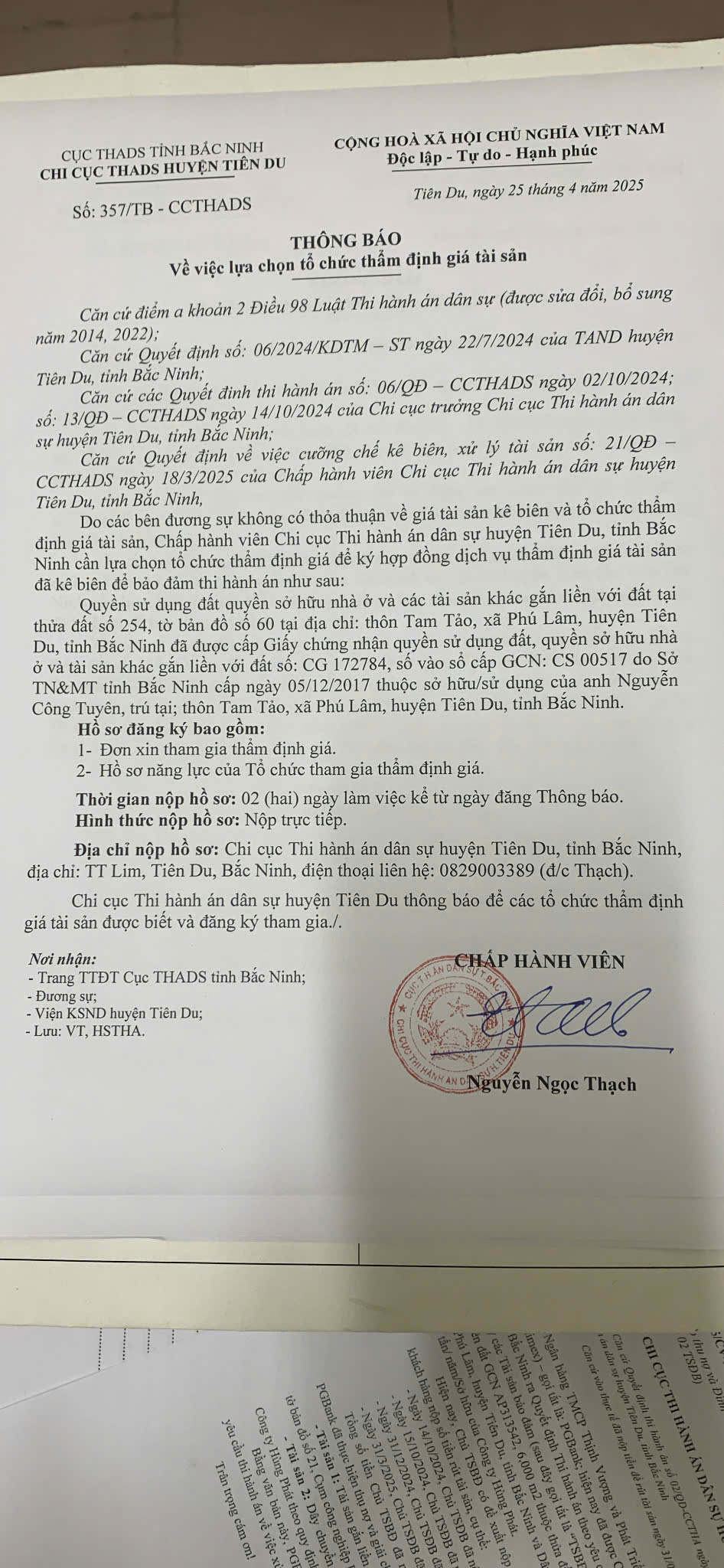 Chấp hành viên Nguyễn Ngọc Thạch đăng thông báo thẩm định giá số: 357-25/4/2025