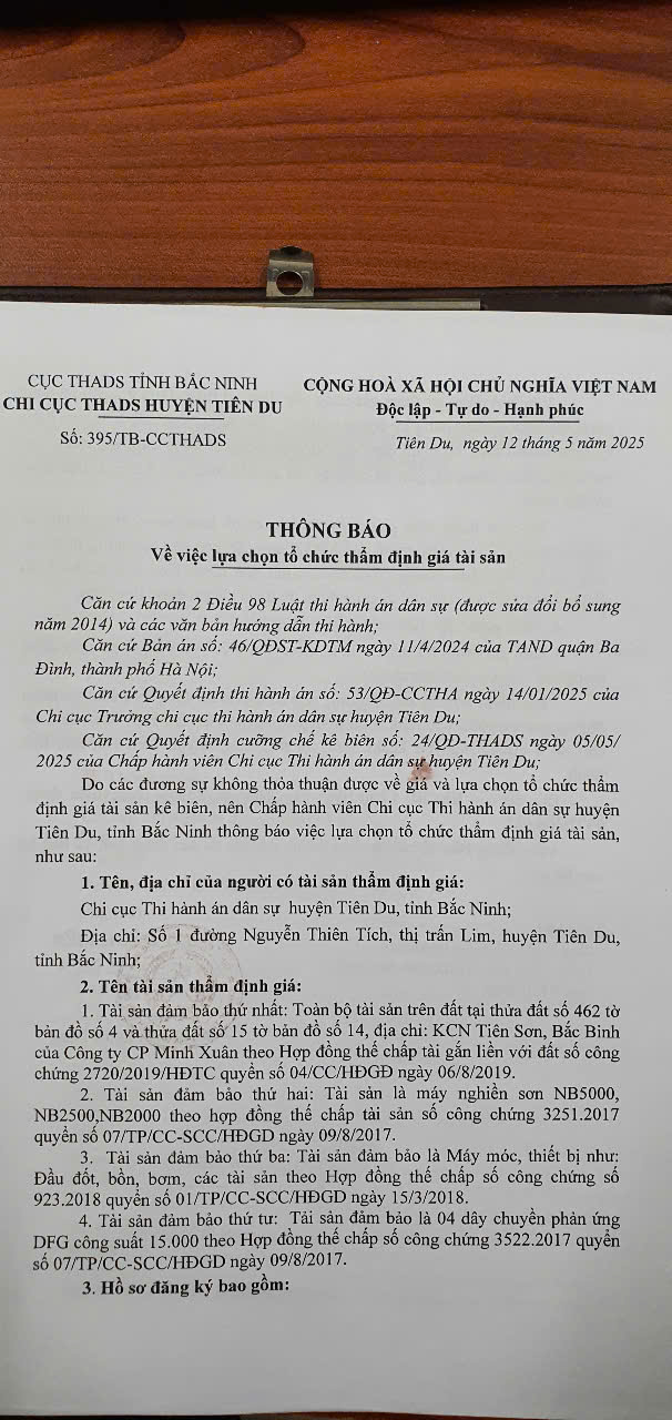 Chấp hành viên Nguyễn Thanh Tùng - Chi cục THADS huyện Tiên Du đăng thông báo thẩm định giá số: 395/TB-CCTHADS ngày 12/5/2025