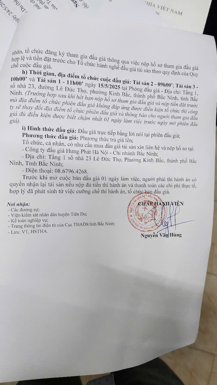Chấp hành viên Nguyễn Văn Hùng- Chi cục THADS huyện Tiên Du đăng thông báo bán tài sản số:360/TB-THADS ngày 25/4/2025
