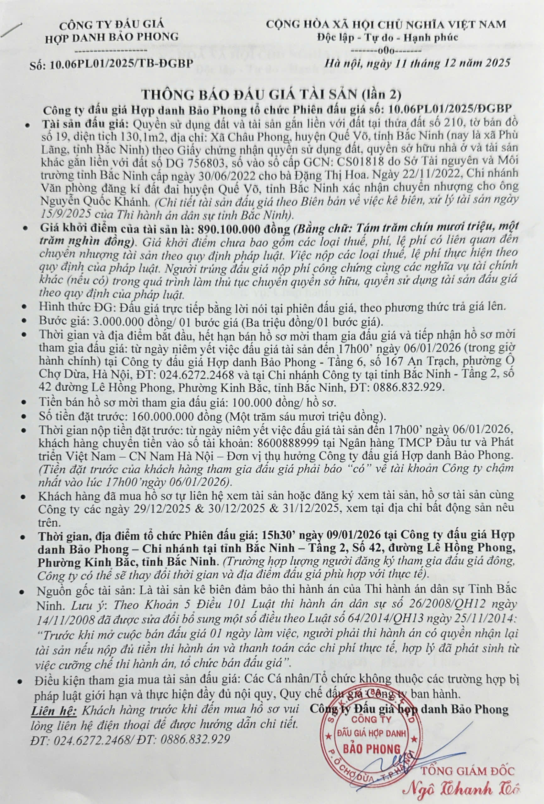 Thông báo bán đấu giá số 10.06PL01/2025/TB-DGBP ngày 11/12/2025 ( Lần 2 )