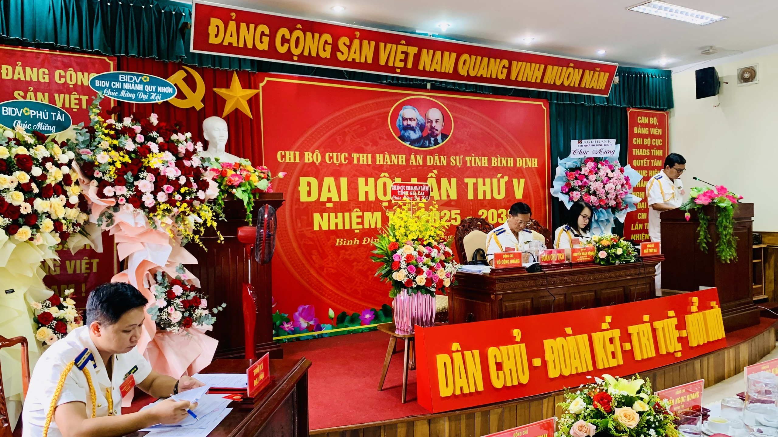 Ngày 12 tháng 6 năm 2025, tại thành phố Quy Nhơn, Chi bộ Cục Thi hành án dân sự (THADS) tỉnh Bình Định long trọng tổ chức Đại hội Chi bộ lần thứ V, nhiệm kỳ 2025-2030. Đồng chí Lê Thị Thu Hằng, UVBCH, Phó Trưởng ban Ban Tổ chức Đảng uỷ các cơ quan Đảng tỉnh đến dự và chỉ đạo Đại hội. Tham dự Đại hội còn có đại diện lãnh đạo các Ban xây dựng Đảng thuộc Đảng bộ các cơ quan Đảng tỉnh; đồng chí Đào Trọng Giáp, Bí thư Chi bộ, Cục trưởng Cục THADS tỉnh Gia Lai; đồng chí Nguyễn Ngọc Quang, Phó Bí thư Chi bộ, Phó Cục trưởng Cục THADS tỉnh Gia Lai; đồng chí Nguyễn Hồng Vinh, Phó Cục trưởng Cục THADS tỉnh Phú Yên, nguyên Phó Cục trưởng, Phó Bí thư Chi bộ Cục THADS tỉnh Bình Định. Chi bộ đã triệu tập 25/25 đảng viên trong Chi bộ Cục Thi hành án dân sự tỉnh tham dự Đai hội. Theo hướng dẫn của cấp uỷ cấp trên, Đại hội lần này thực hiện 02 nội dung là (1) Báo cáo tổng kết Nghị quyết Đại hội Chi bộ nhiệm kỳ 2020 – 2025 và phương hướng, chỉ tiêu, nhiệm vụ nhiệm kỳ 2025-2030; kiểm điểm sự lãnh đạo, chỉ đạo của BCH Chi bộ nhiệm kỳ 2020-2025, (2) Báo cáo tổng hợp ý kiến tham gia dự thảo Văn kiện Đại hội XIV của Đảng. Đây là sự kiện chính trị quan trọng, đánh dấu bước phát triển mới trong công tác xây dựng và củng cố tổ chức đảng, đồng thời là dịp để Chi bộ Cục Thi hành án dân sự tỉnh nhìn lại những thành tựu đã đạt được và đề ra chỉ tiêu, phương hướng, nhiệm vụ cho nhiệm kỳ tới.