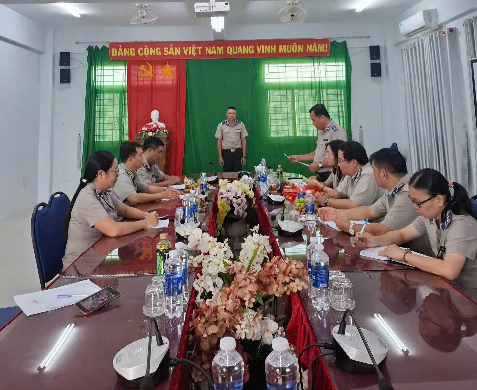 Đồng chí Đào Phú Quốc cùng đồng chí Đỗ Tuấn Hùng phát biểu chỉ đạo quán triệt về mục đích, yêu cầu của việc điều động công chức đối với đồng chí Trần Quốc Hưng, đề nghị Ban Lãnh đạo Phòng THADS Khu vực 5 quan tâm bố trí, phân công nhiệm vụ phù hợp với sở trường, năng lực để đồng chí Hưng có thể phát huy tối ưu năng lực phục vụ tốt nhất công việc được giao, đề nghị tập thể công chức đơn vị quan tâm chia sẽ, cùng hỗ trợ đồng chí Hưng trong thực hiện nhiệm vụ góp phần hoàn thành chỉ tiêu, nhiệm vụ chung; yêu cầu đồng chí Hưng khẩn trương hoàn tất thủ tục bàn giao tất cả các công việc, hồ sơ tài liệu có liên quan tại đơn vĩ cũ, là công chức trẻ, đầy nhiệt huyết phải tiếp tục trao dồi về năng lực, phát huy tính sáng tạo, đoàn kết, cố gắng phấn đấu thực hiện tốt, xuất sắc nhiệm vụ được phân công.