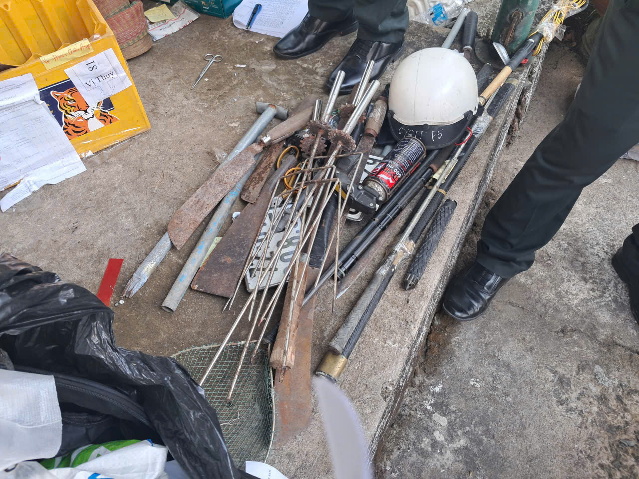 + Nhóm hung khí: Nhiều dao tự chế (dài từ 15cm đến 90cm), mã tấu, thanh sắt nhọn, gậy ba khúc, bình xịt hơi cay nhãn hiệu NATO và công cụ kích điện ….