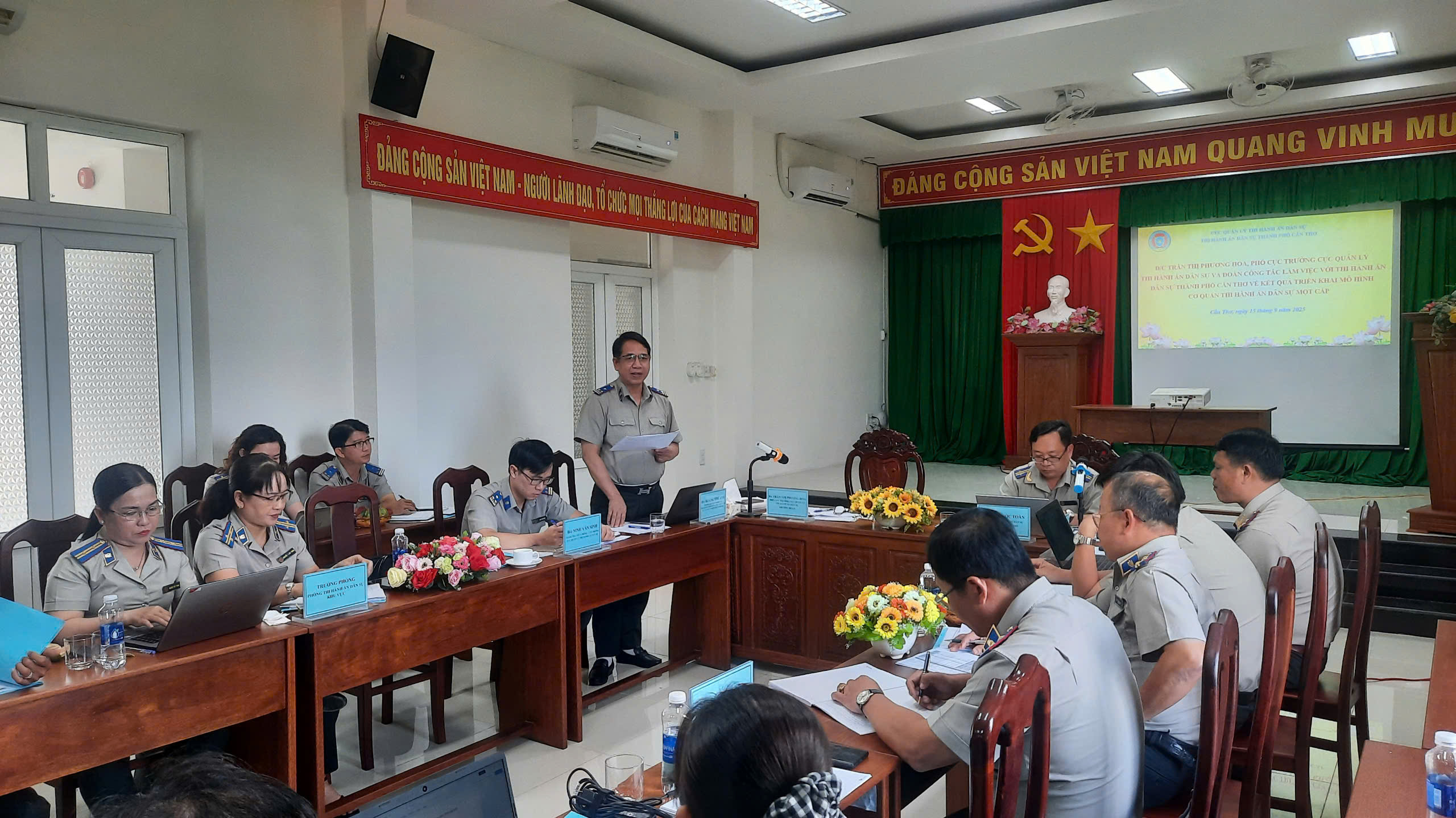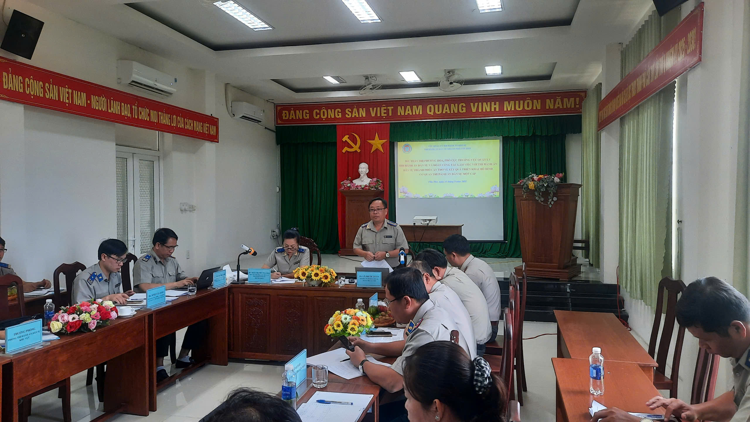 Về công tác chỉ đạo, điều hành: Lãnh đạo Thi hành án dân sự thành phố Cần Thơ đã kịp thời quán triệt, triển khai đến các phòng và tương đương trực thuộc, toàn thể Chấp hành viên và công chức các văn bản chỉ đạo của Cục Quản lý Thi hành án dân sự, nhất là các Quy trình tổ chức thi hành án dân sự trong nội bộ. Chủ động, bám sát chỉ đạo của Cục Quản lý Thi hành án dân sự, Ủy ban nhân dân thành phố Cần Thơ và các quy định pháp luật có liên quan, kịp thời ban hành các văn bản phân công nhiệm vụ trong lãnh đạo Thi hành án dân sự thành phố, Quy chế làm việc, Quy chế chi tiêu nội bộ, Quy chế sử dụng tài sản công, Quy chế thực hiện dân chủ, Quyết định chức năng, nhiệm vụ của các phòng và tương đương trực thuộc; đồng thời tăng cường ứng dụng công nghệ thông tin trong quản lý, điều hành để bảo đảm thông tin chỉ đạo được truyền đạt nhanh chóng, chính xác. Tham mưu Ủy ban nhân dân thành phố ban hành văn bản chỉ đạo các Sở, ban ngành và Ủy ban nhân dân các xã, phường tăng cường phối hợp công tác thi hành án dân sự. Tổ chức các buổi làm việc trực tiếp với lãnh đạo các phòng và tương đương trực thuộc để nắm tình hình, rà soát, kiểm tra, đôn đốc thực hiện chỉ tiêu, nhiệm vụ được giao trong năm 2025.