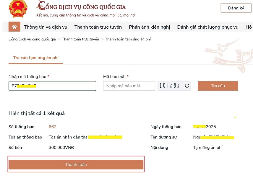 - Tại mục Thanh toán trực tuyến trên Cổng DVCQG, công dân chọn mục Nộp tạm ứng án phí và chuyển khoản tiền tạm ứng án phí theo hướng dẫn trên Cổng DVCQG.