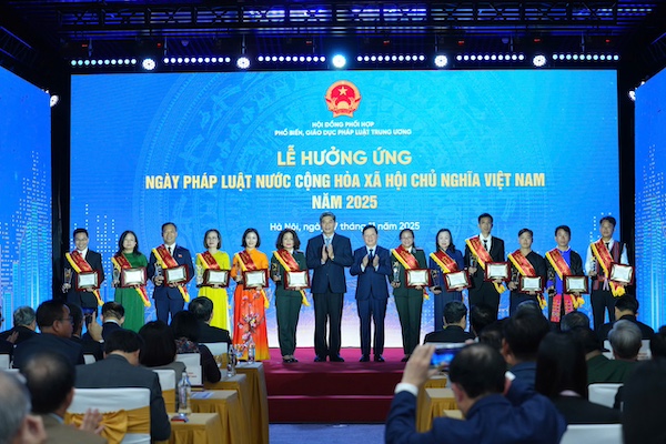 Để kịp thời ghi nhận, biểu dương, động viên và khuyến khích các tập thể, cá nhân ở các Ban, Bộ, cơ quan, tổ chức Trung ương, địa phương đạt thành tích xuất sắc trong công tác xây dựng và thi hành pháp luật giai đoạn 2024-2025, Thủ tướng Chính phủ đã ban hành Quyết định số 2450/QĐ-TTg ngày 06/11/2025 tặng Bằng khen cho 13 tập thể, cá nhân tiêu biểu. Ủy viên Bộ Chính trị, Chủ tịch Quốc hội Trần Thanh Mẫn; Ủy viên BCH Trung ương Đảng, Phó Thủ tướng Chính phủ, Chủ tịch Hội đồng phối hợp phổ biến, giáo dục pháp luật Trung ương Hồ Quốc Dũng trao Bằng khen và hoa của Thủ tướng Chính phủ tặng các tập thể, cá nhân.