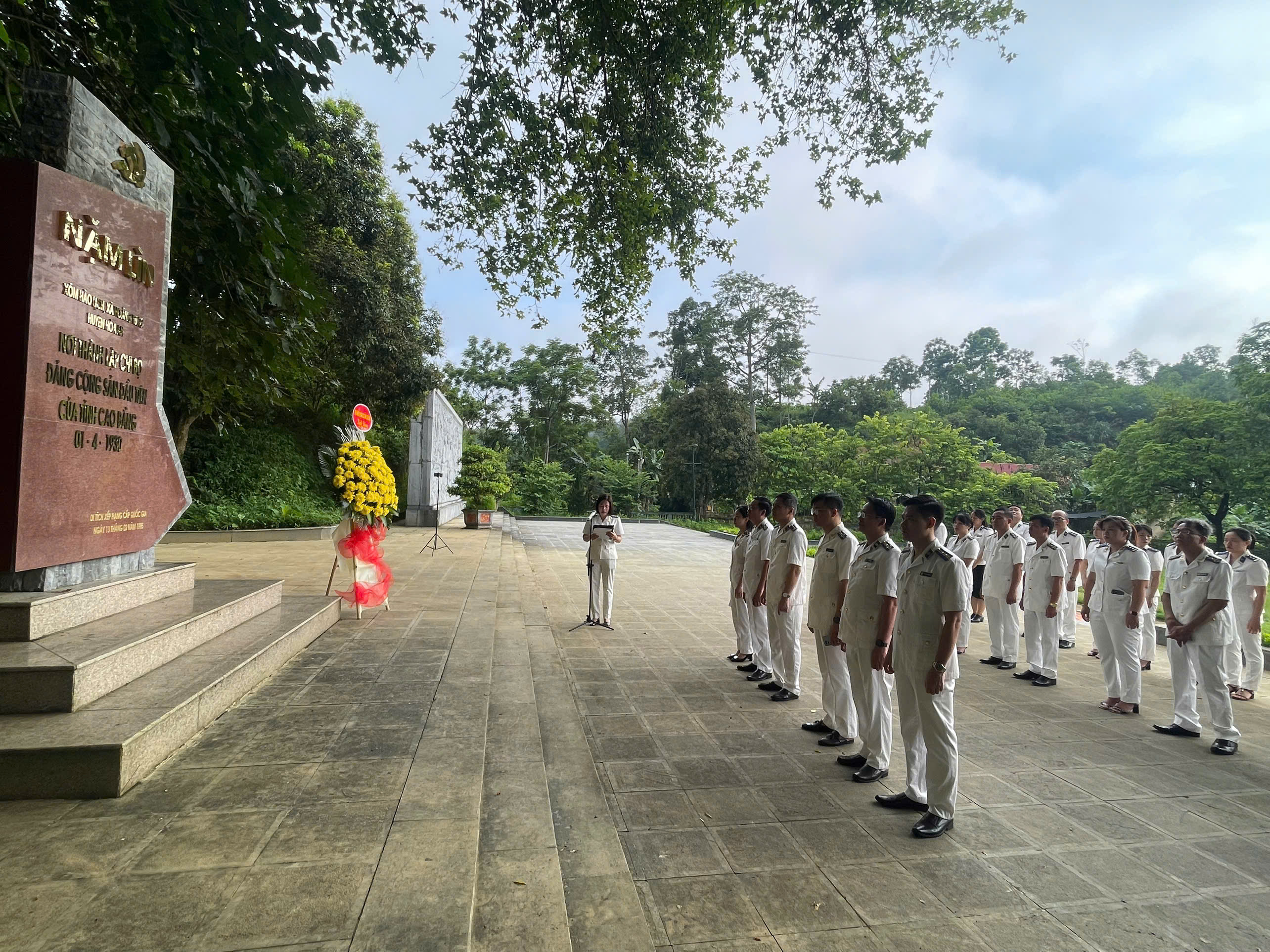Sau nghi thức chào cờ, đồng chí Đoàn Thị Hạ, Trưởng THADS tỉnh Cao Bằng, cùng các đồng chí Phó trưởng THADS tỉnh Cao Bằng đã dâng lẵng hoa tưởng niệm tại bia di tích lịch sử, nơi ghi dấu sự kiện thành lập Chi bộ Đảng Cộng sản đầu tiên của tỉnh nhà.