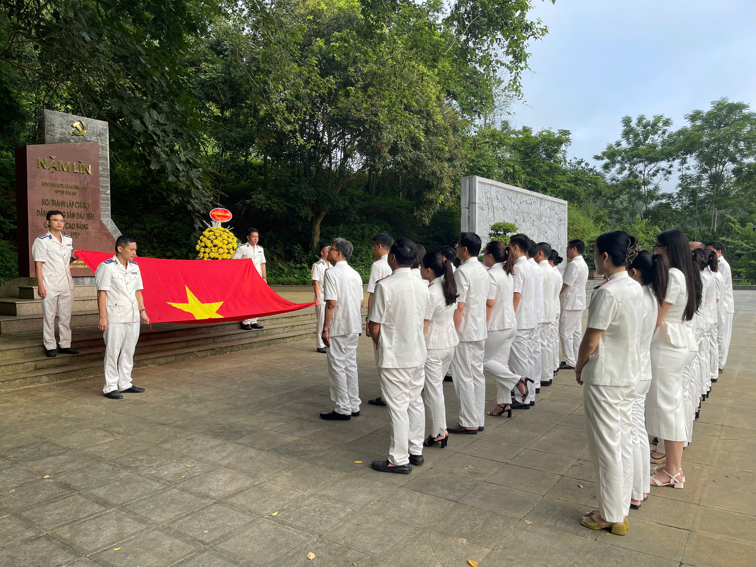 Trước anh linh các bậc tiền bối cách mạng, các đảng viên đã thực hiện nghi thức chào cờ - để thể hiện lòng biết ơn sâu sắc, tinh thần tự hào dân tộc và quyết tâm tiếp bước lý tưởng cách mạng mà các thế hệ cha anh đã dày công vun đắp.
