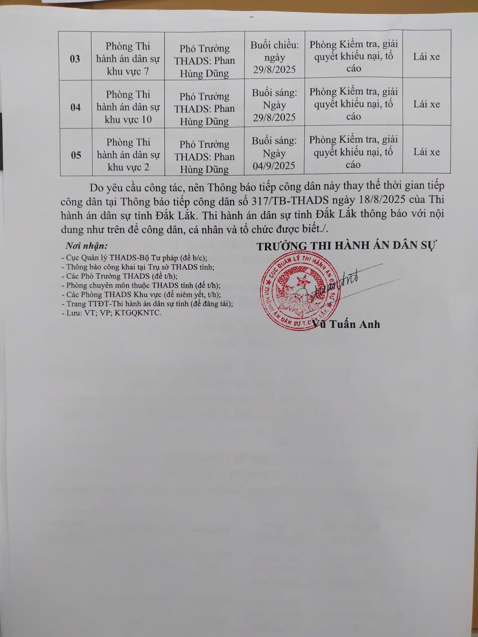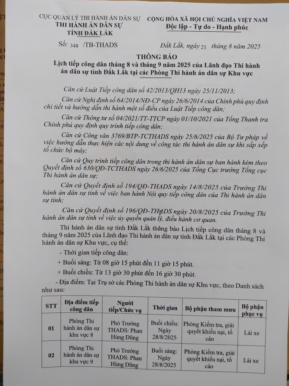 Thông báo lịch tiếp công dân tháng 8 và tháng 9 năm 2025 của Lãnh đạo Thi hành án dân sự tỉnh Đắk Lắk