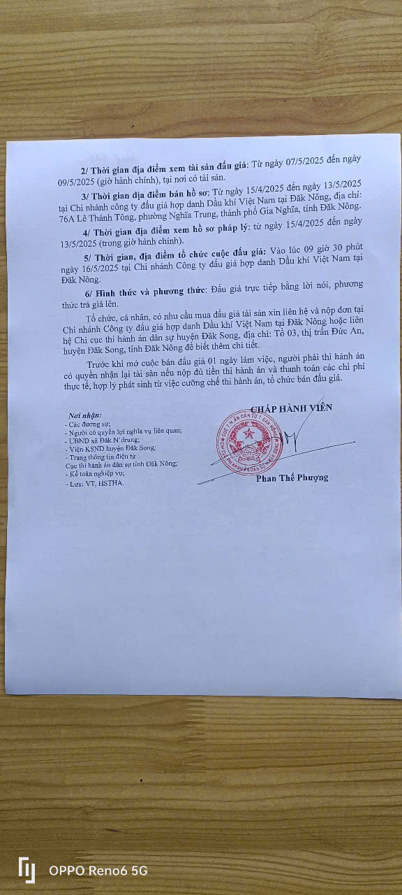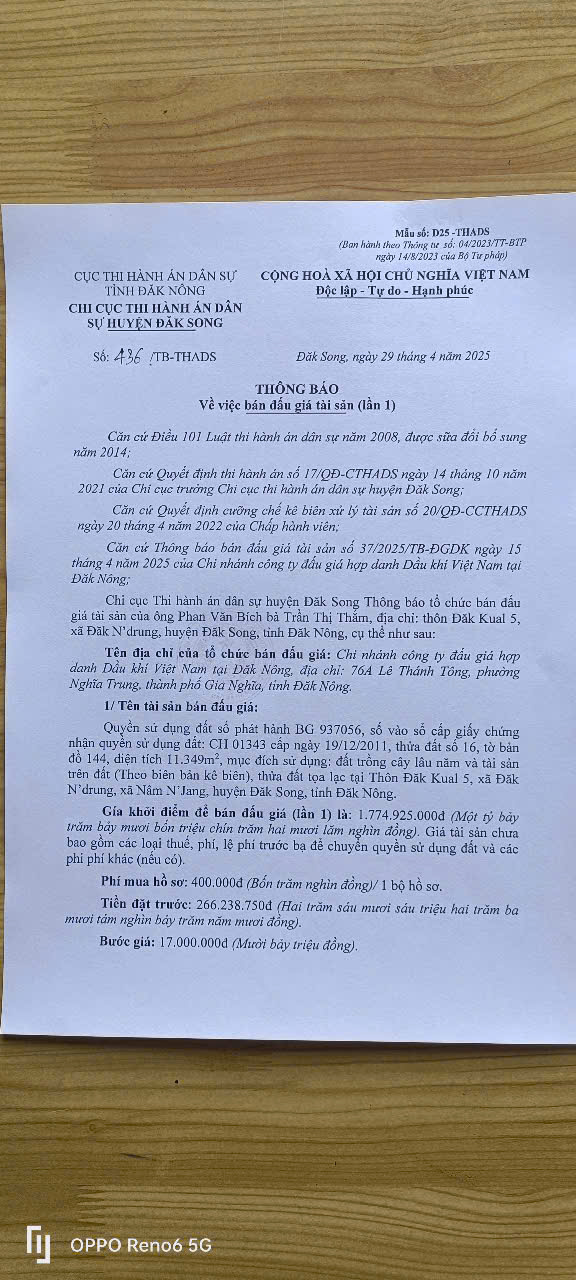Chi cục THADS huyện Đắk Song thông báo về việc bán đấu giá tài sản (Tb số 436 ngày 29/4/2025)