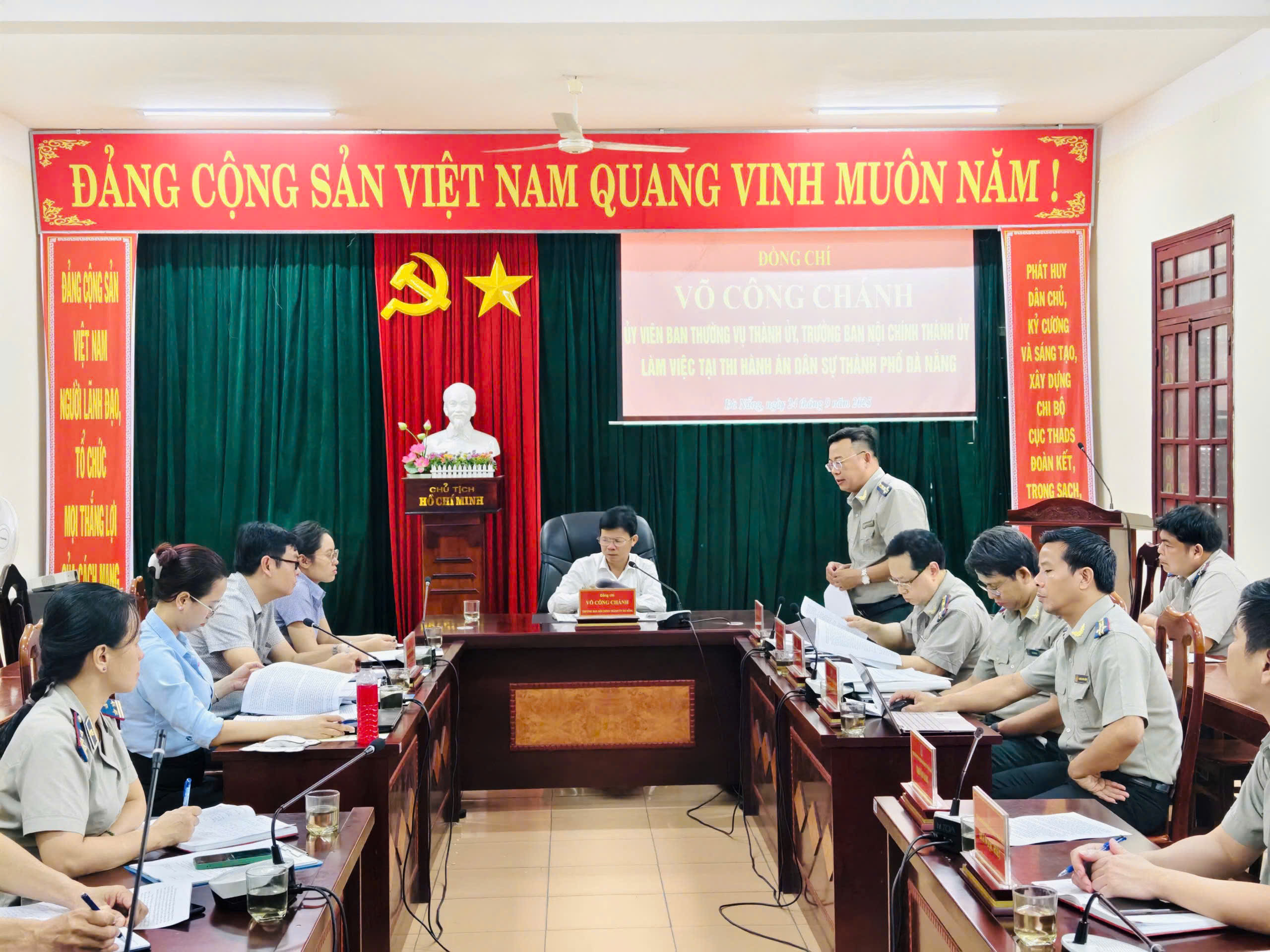 Thay mặt THADS thành phố Đà Nẵng, Trưởng THADS báo cáo với đoàn công tác kết quả công tác thi hành án dân sự, theo dõi thi hành án hành chính năm 2025 và công tác lãnh đạo, chỉ đạo thực hiện kiểm soát quyền lực phòng, chống tham nhũng, tiêu cực trong công tác thi hành án dân sự, cụ thể tính đến ngày 23/9/2025 tổng số phải thi hành là 32.615 việc, trong đó: Số thụ lý mới là 21.857 việc, tăng 1.348 việc (tăng 4,23%) so với cùng kỳ năm 2024; Số có điều kiện thi hành là 21.169 việc; Số chưa có điều kiện (trừ số đã chuyển sổ theo dõi riêng) là 10.364 việc, tương ứng với số tiền phải giải quyết là 31.790 tỷ 043 triệu 881 nghìn đồng, trong đó: Số thụ lý mới là 11.030 tỷ 627 triệu 431 nghìn đồng, tăng 1.474 tỷ 759 triệu 962 nghìn đồng (tăng 15,43%) so với cùng kỳ năm 2024; Số có điều kiện thi hành là 13.315 tỷ 335 triệu 616 nghìn đồng; Số chưa có điều kiện (trừ số đã chuyển sổ theo dõi riêng) là 16.559 tỷ 402 triệu 698 nghìn đồng. Đã thi hành xong 17.822 việc, đạt tỉ lệ 84.19% (đứng thứ 7/34 tỉnh, thành phố), với số tiền giải quyết xong là 8.571 tỷ 195 triệu 712 nghìn đồng, đạt tỉ lệ 64.37% (đứng thứ 1/34 tỉnh, thành phố). Công tác thu hồi tài sản trong các vụ án tham nhũng, kinh tế có nhiều nỗ lực, đã thi hành xong 60 việc với số tiền giải quyết xong là 37 tỷ 615 triệu 530 nghìn đồng.