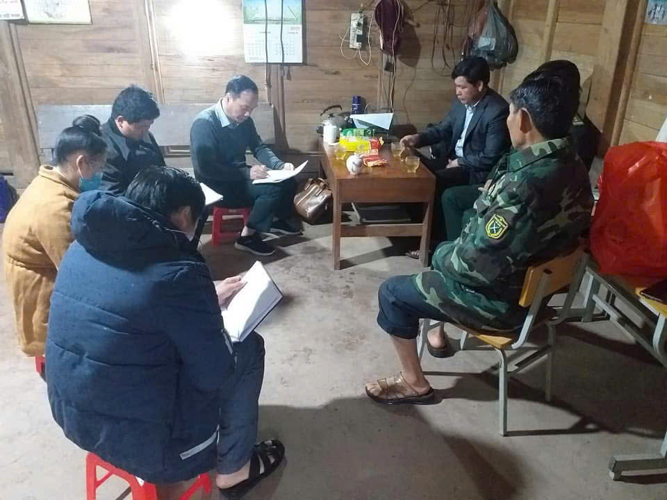 Chú thích ảnh: Chấp hành viên Đỗ Thành Trung ( thứ 3 từ trái sang) tổ chức họp cùng Bí thư chi bộ, trưởng bản và các lực lượng đứng chân trên địa bàn về phương án giải quyết án trên địa bàn bản Nậm Nhừ 3, xã Nậm Nhừ, huyện Nậm Pồ.