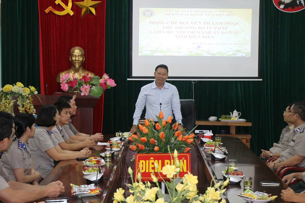 Sau khi nghe các nội dung báo cáo, Thứ trưởng Nguyễn Thanh Ngọc đã biểu dương, ghi nhận những kết quả THADS tỉnh Điện Biên đã đạt được trong thời gian vừa qua. Đồng thời, chia sẻ những khó khăn về con người, cơ sở vật chất và đặc thù tỉnh miền núi, biên giới của THADS tỉnh Điện Biên. Về nhiệm vụ trọng tâm trong thời gian tới, Thứ trưởng yêu cầu tập thể Lãnh đạo THADS tỉnh tiếp tục bám sát chỉ đạo của của Bộ Tư pháp, Cục quản lý THADS, của Tỉnh ủy, UBND tỉnh về công tác THADS, theo dõi THAHC; giữ gìn khối đoàn kết nội bộ, nâng cao chất lượng hiệu quả công tác quản lý, chỉ đạo, điều hành; nêu cao tinh thần trách nhiệm của mỗi cá nhân, công chức thi hành án, nhất là người đứng đầu trong tổ chức thực hiện nhiệm vụ được giao; chỉ đạo, tổ chức triển khai thực hiện nghiêm túc các Chỉ thị, Nghị quyết của Đảng, các yêu cầu, nhiệm vụ THADS, theo dõi THAHC theo tinh thần Nghị quyết số 96/2019/QH14 ngày 27/11/2019 của Quốc hội; Nghị quyết số 23-NQ/BCSĐ ngày 29/3/2022 của Ban cán sự Đảng Bộ Tư pháp về lãnh đạo thực hiện các nhiệm vụ trọng tâm THADS, theo dõi THAHC giai đoạn 2022-2026; triển khai đồng bộ, hiệu quả các chỉ tiêu, nhiệm vụ được giao ngay từ đầu năm công tác 2026; đảm bảo đúng quy trình, trình tự, thủ tục thi hành án theo quy định của pháp luật. Đối với những khó khăn, vướng mắc THADS tỉnh đang gặp phải, cái nào trong thẩm quyền của THADS tỉnh Điện Biên thì cố gắng tháo gỡ, cùng nhau vượt qua khó khăn. Còn những khó khăn nào thuộc thẩm quyền của Bộ, Thứ trưởng sẽ báo cáo về Bộ để có giải pháp xử lý phù hợp, hiệu quả nhất.