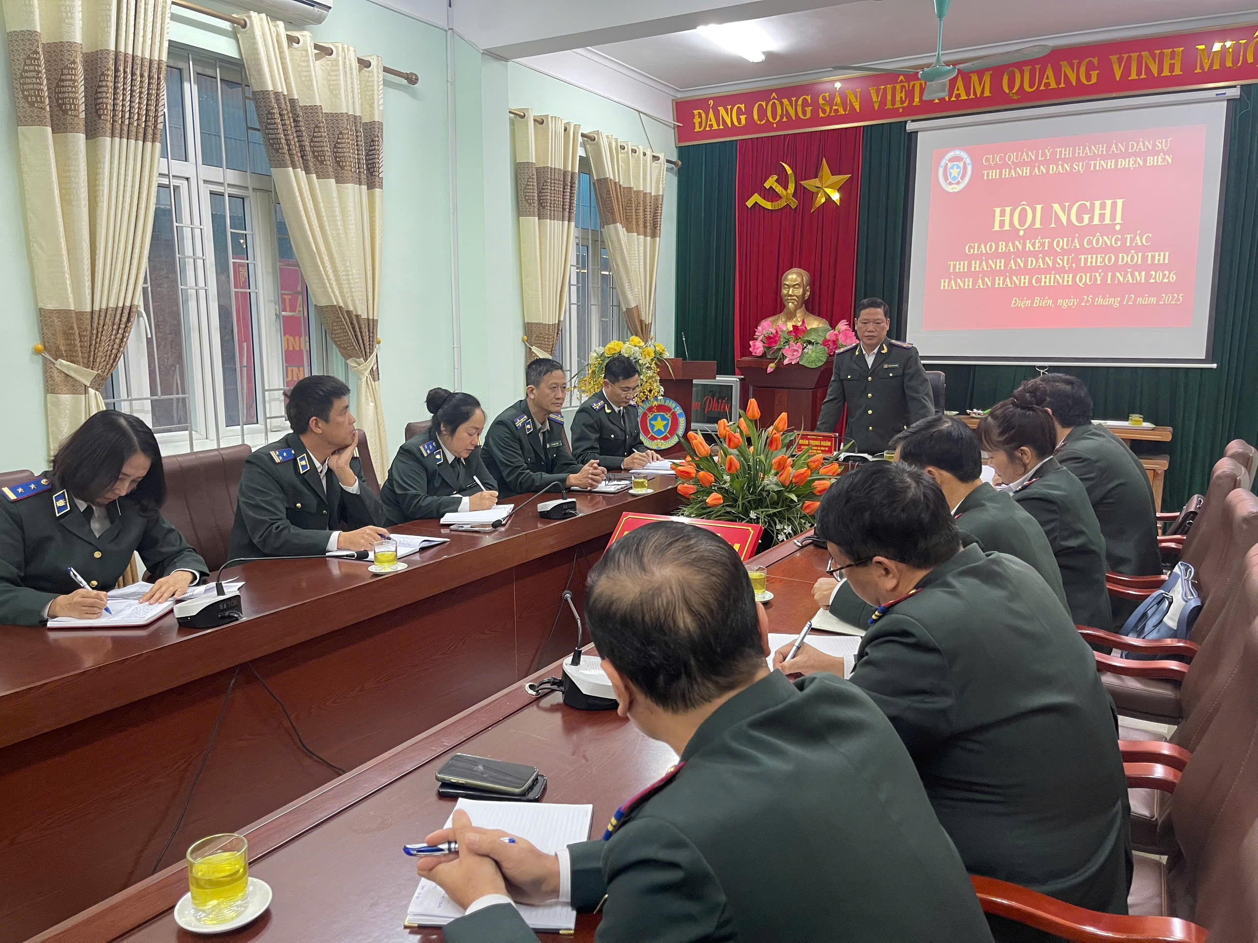 Thực hiện Kế hoạch số 1632/KH-THADS ngày 19/12/2025 của Thi hành án dân sự (THADS) tỉnh Điện Biên về tổ chức Hội nghị giao ban công tác THADS, theo dõi Thi hành án hành chính (THAHC) Quý I năm 2026. Chiều ngày 25/12/2025, THADS tỉnh Điện Biên tổ chức Hội nghị giao ban đánh giá kết quả công tác THADS, theo dõi THAHC Quý I năm 2026. Đồng chí Đoàn Trọng Ngôn, Trưởng THADS tỉnh Điện Biên chủ trì Hội nghị, tham dự Hội nghị có Lãnh đạo THADS tỉnh; Lãnh đạo các phòng chuyên môn và lãnh đạo các Phòng THADS khu vực trực thuộc.