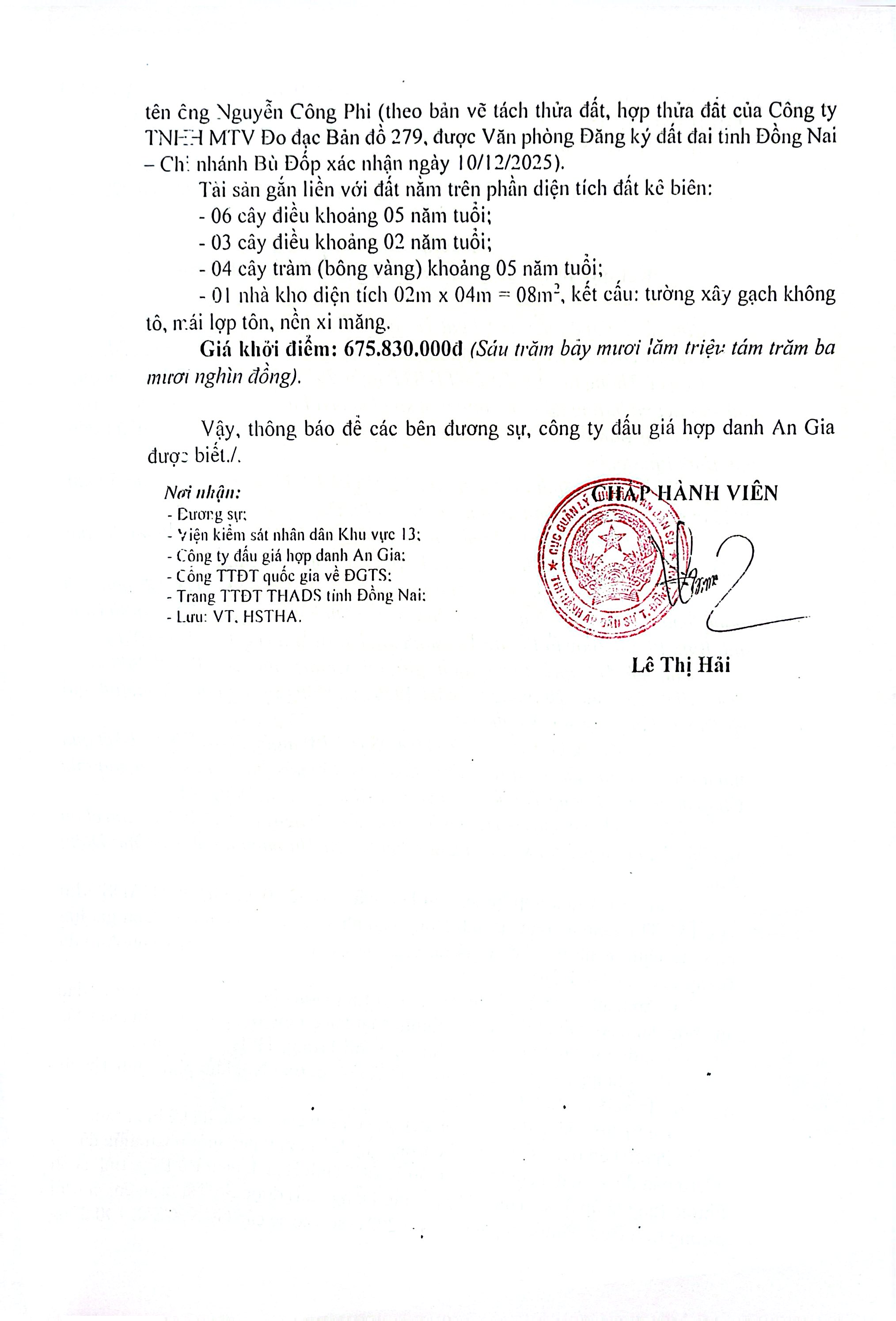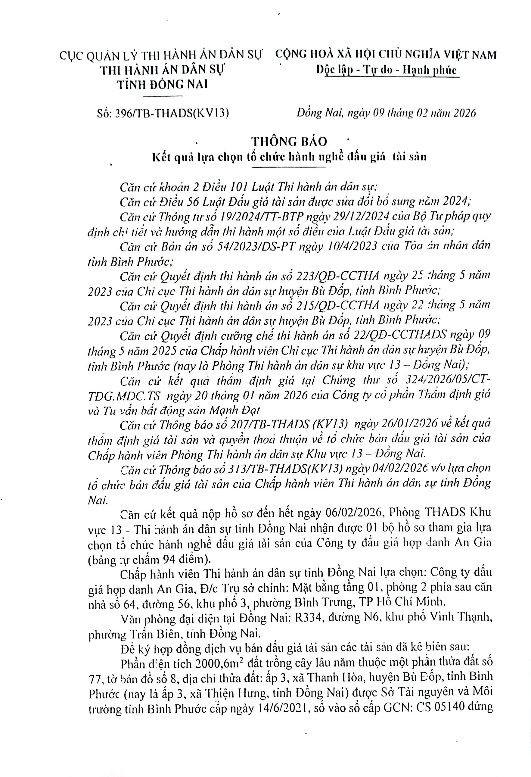 Phòng Thi hành án dân sự khu vực 13 , tỉnh Đồng Nai - Thông báo 396 về kết quả lựa chọn tổ chức hành nghề đấu giá tài sản thi hành án (chv Hải)