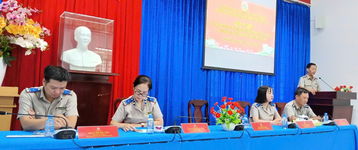 Tại buổi lễ, đại diện Phòng Tổ chức cán bộ đã công bố các Quyết định về việc bổ nhiệm Chấp hành viên sơ cấp. Theo đó, ông Trần Quốc Khánh và bà Nguyễn Thị Anh Thư vinh dự được trao Quyết định bổ nhiệm vào ngạch Chấp hành viên sơ cấp đợt này. Đây là sự ghi nhận xứng đáng cho quá trình phấn đấu, rèn luyện về phẩm chất chính trị, đạo đức lối sống cũng như năng lực chuyên môn nghiệp vụ của các đồng chí trong thời gian qua.