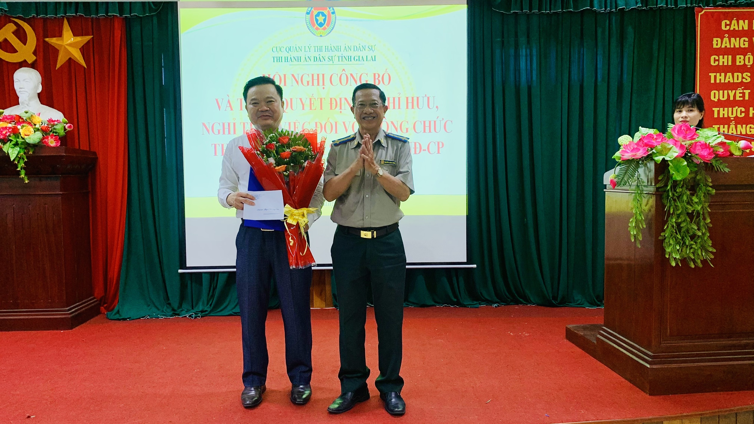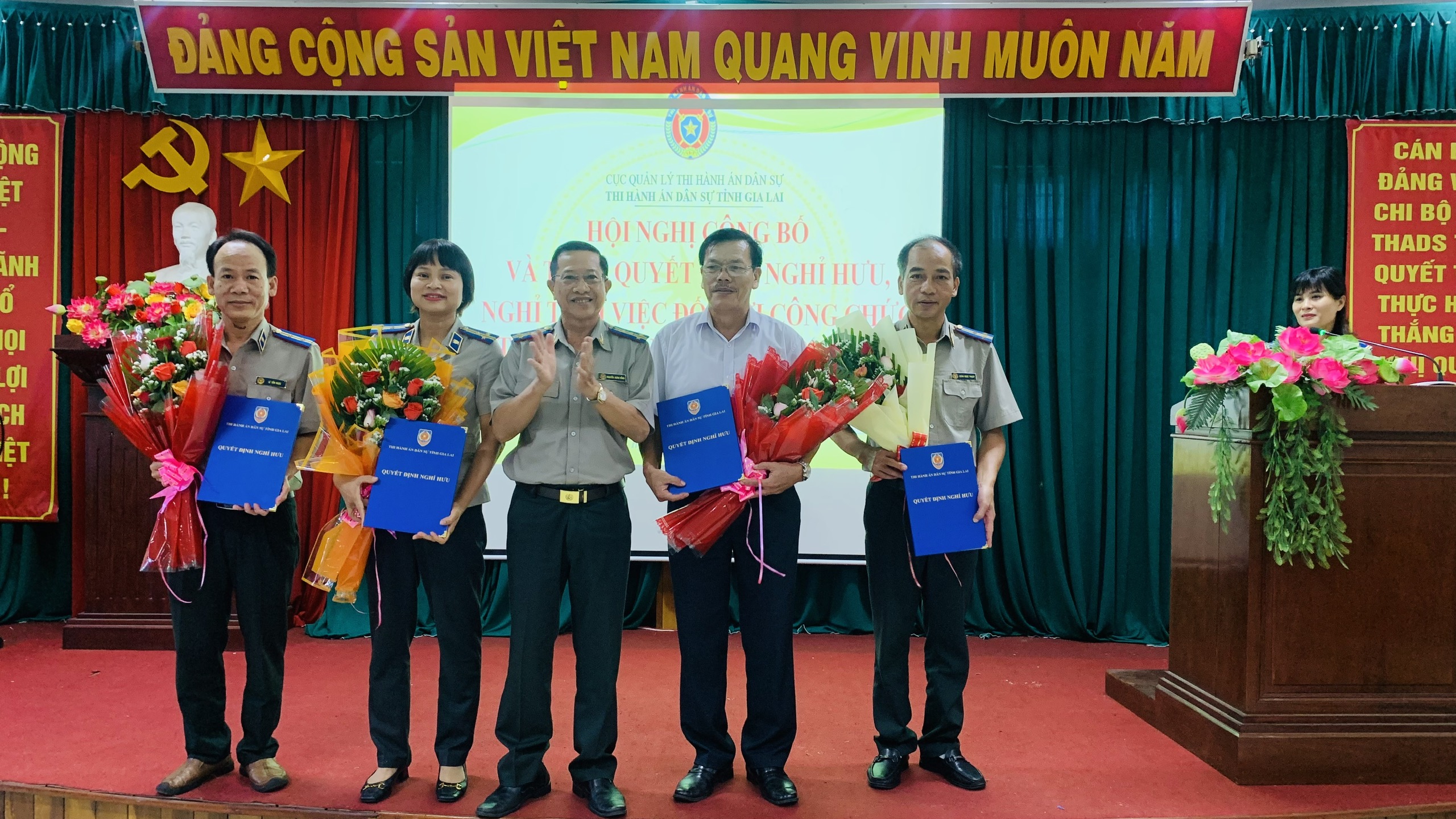 Ngày 04 tháng 9 năm 2025, Thi hành án dân sự tỉnh Gia Lai đã tổ chức hội nghị trao quyết định nghỉ hưu trước tuổi, nghỉ thôi việc theo Nghị định 178/2024/NĐ-CP ngày 31/12/2024 của Chính phủ về chính sách, chế độ đối với cán bộ, công chức, viên chức, người lao động và lực lượng vũ trang trong thực hiện sắp xếp tổ chức bộ máy của hệ thống chính trị cho công chức và người lao động thuộc Thi hành án dân sự tỉnh. Tham dự và chủ trì hội nghị có đồng chí Nguyễn Xuân Hồng, Bí thư Đảng uỷ, Trưởng Thi hành án dân sự tỉnh; đồng chí Võ Công Hoàng, Phó Bí thư Đảng uỷ, Phó trưởng THADS tỉnh; các đồng chí trong Ban Thường vụ, Ban Chấp hành Đảng uỷ, Lãnh đạo Thi hành án dân sự tỉnh; Thủ trưởng các đơn vị thuộc Thi hành án dân sự tỉnh và các đồng chí được nhận quyết định nghỉ hưu trước tuổi. Trong đợt nghỉ hưu lần này, toàn tỉnh có 38 người, trong đó công chức là 28 người, người lao động là 10 người; có 12 người nghỉ hưu trước tuổi, 26 người nghỉ thôi việc; trong số đó có 17 chấp hành viên, 01 kế toán và 10 công chức khác.