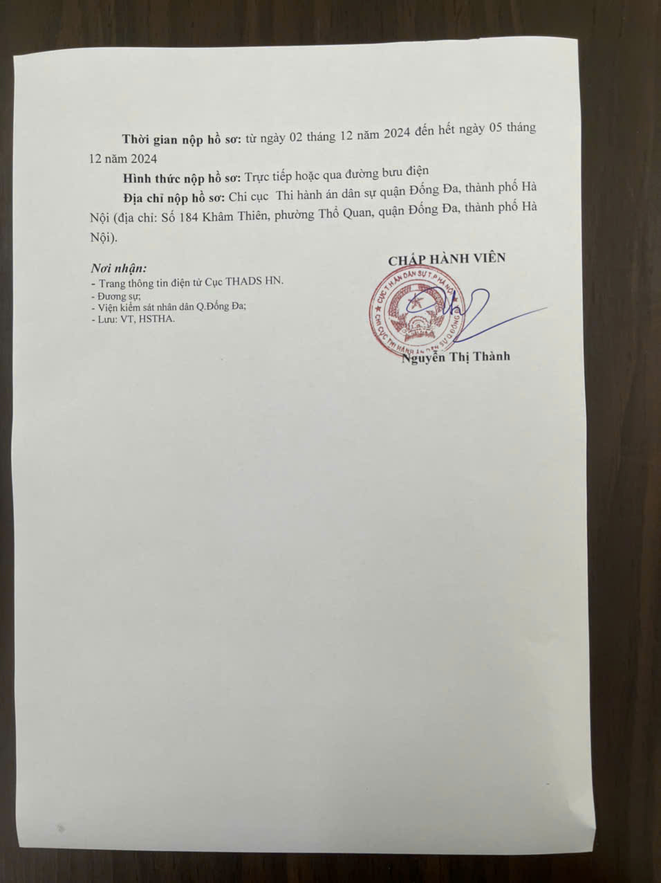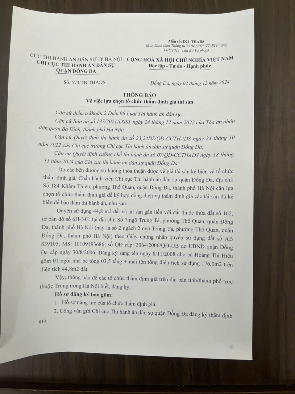 Chi cục thi hành án dân sự Quận Đống Đa thông báo số 573/TB-THADS ngày 02/12/2024 về việc lựa chọn tổ chức thẩm định giá