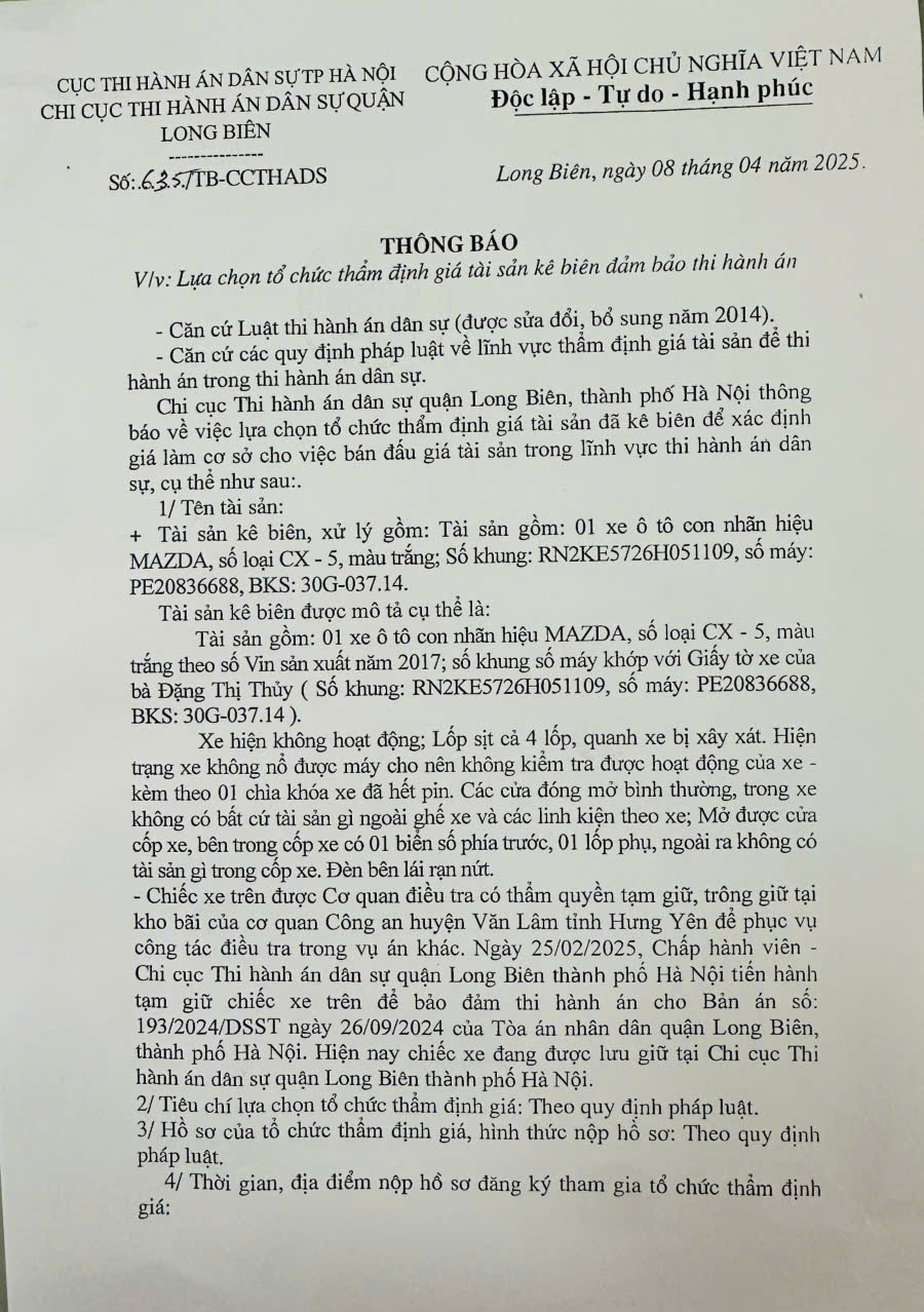 Chi cục Thi hành án dân sự quận Long Biên thông báo lựa chọn tổ chức thẩm định giá tài sản số 635/TB-CCTHADS ngày 08/4/2025