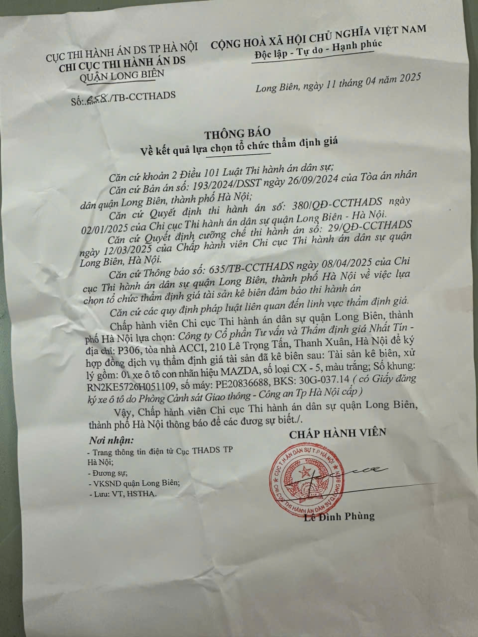 Chi cục Thi hành án dân sự quận Long Biên thông báo về kết quả lựa chọn tổ chức thẩm định giá số 658/TB-CCTHADS ngày 11/4/2025