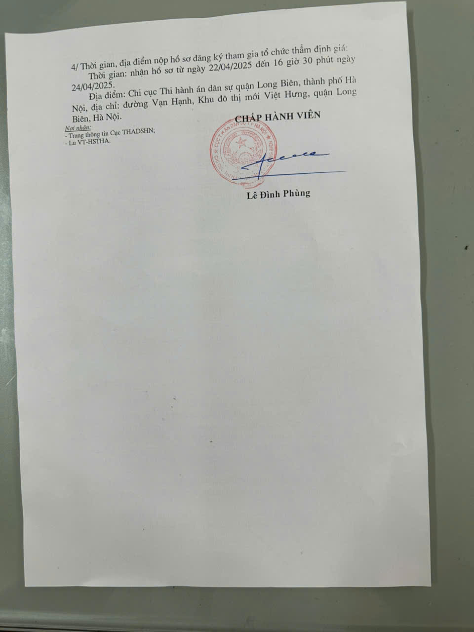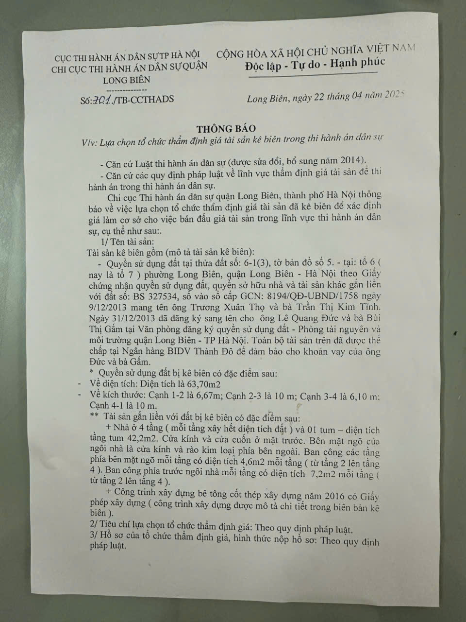 Chi cục Thi hành án dân sự quận Long Biên thông báo lựa chọn tổ chức thẩm định giá tài sản số 701/TB-CCTHADS ngày 22/4/2025