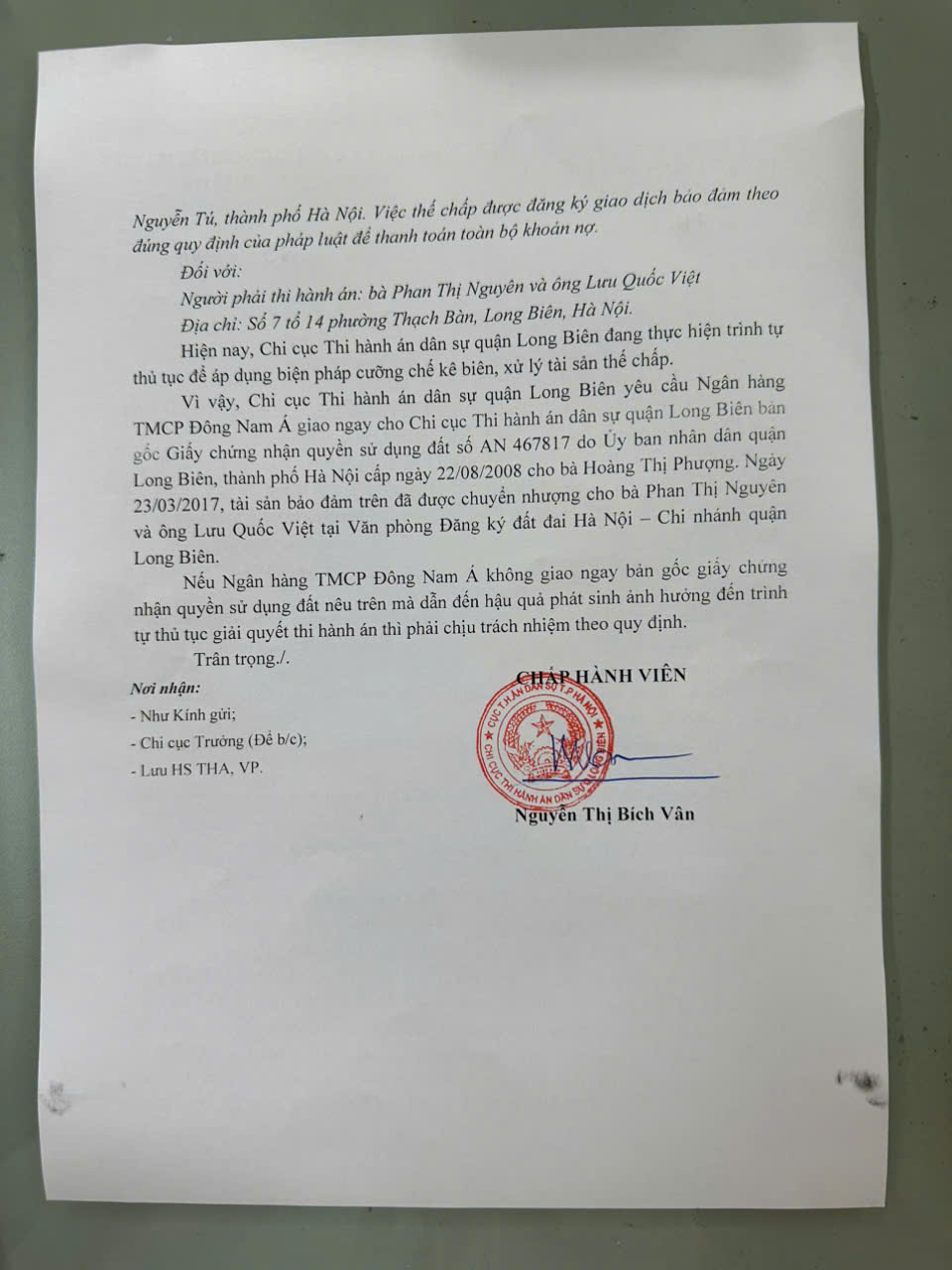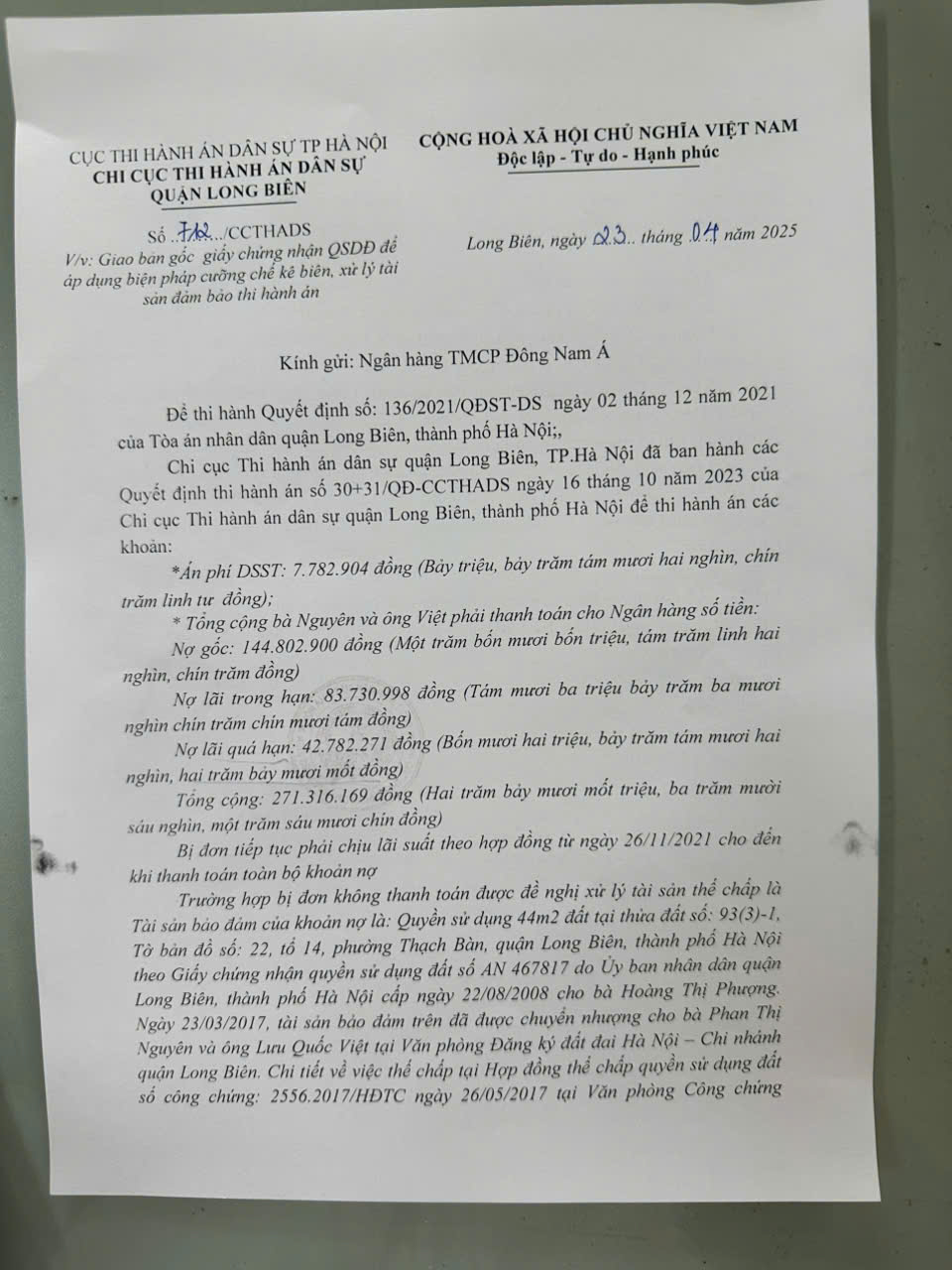 Chi cục Thi hành án dân sự quận Long Biên thông báo kết quả lựa chọn tổ chức thẩm định giá tài sản số 725/TB-CCTHADS ngày 25/4/2025