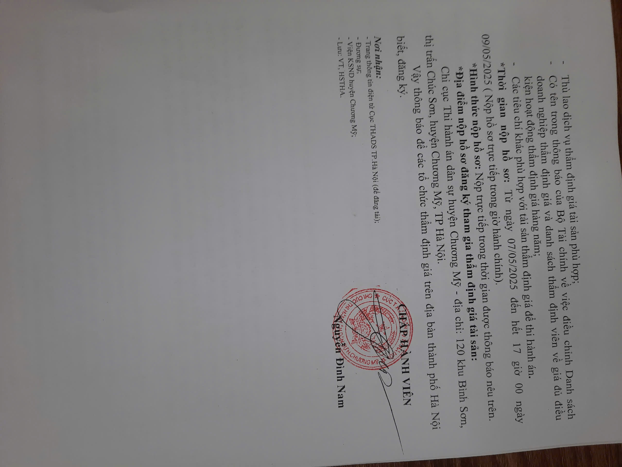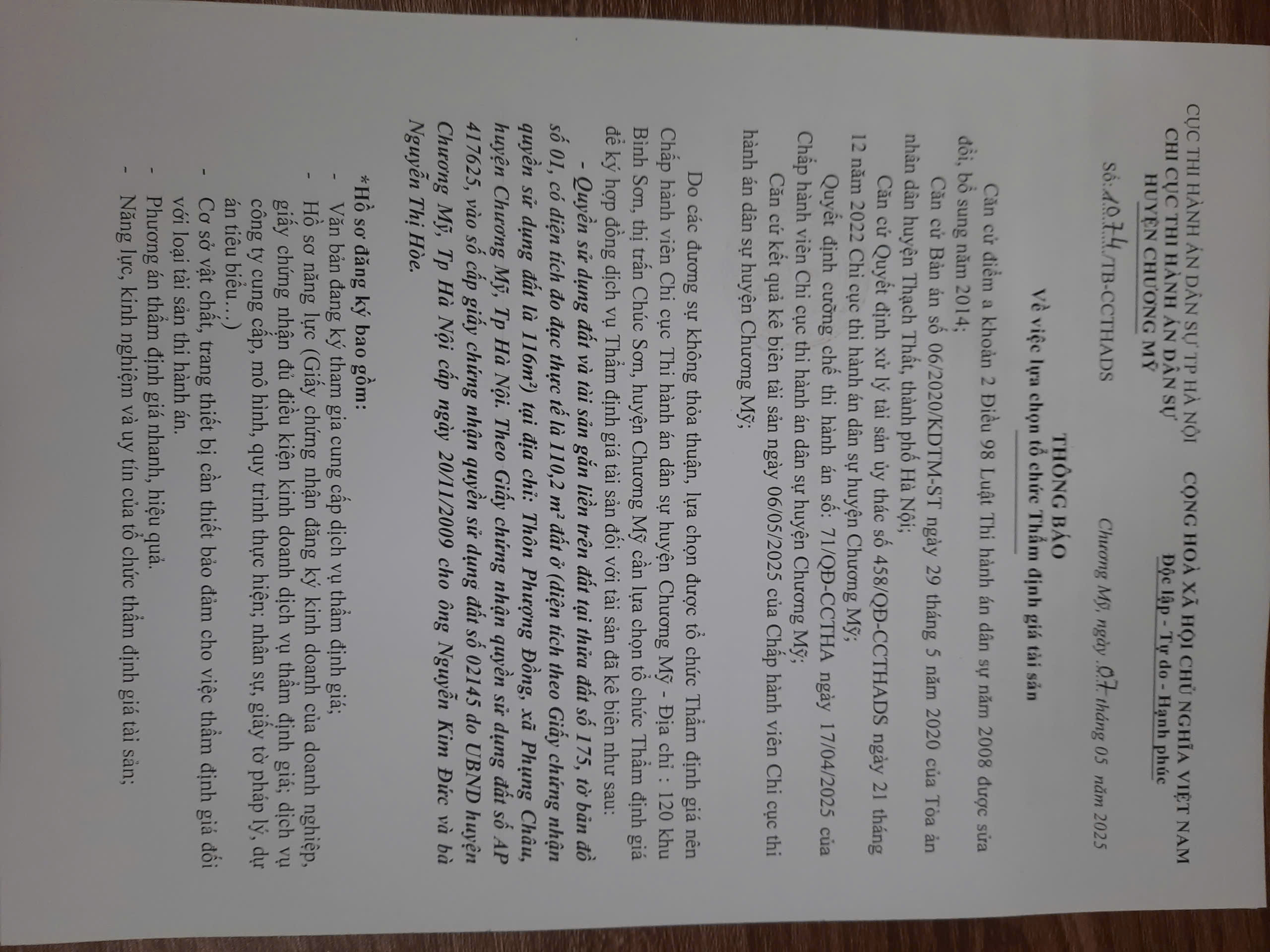 Thông báo lựa chọn tổ chức thẩm định giá số 1074 ngày 07/05/2025 của Chi cục THADS Chương Mỹ ( CHV Nam)