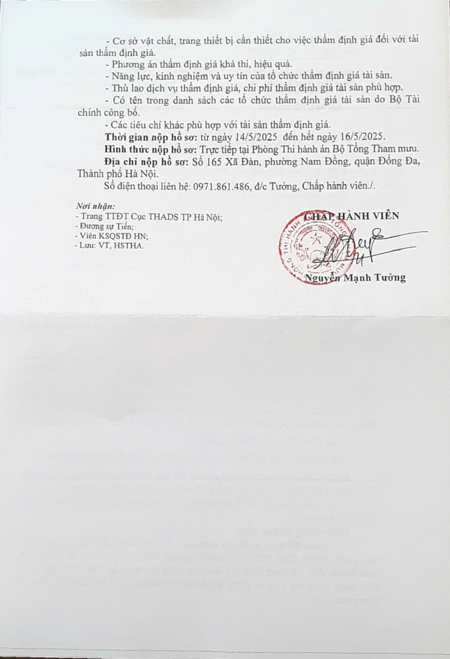 Phòng Thi hành án Bộ Tổng tham mưu thông báo số 185/TB-THADS ngày 12/5/2025 về việc lựa chọn tổ chức thẩm định giá tài sản