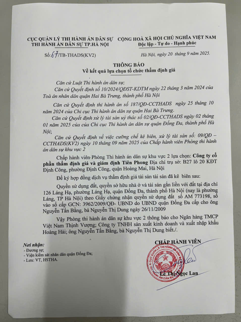 Phòng Thi hành án dân sự Khu Vực 2 - Hà Nội Thông báo về kết quả lựa chọn tổ chức thẩm định giá số 67/TB - THADS (KV2) ngày 20/9/2025