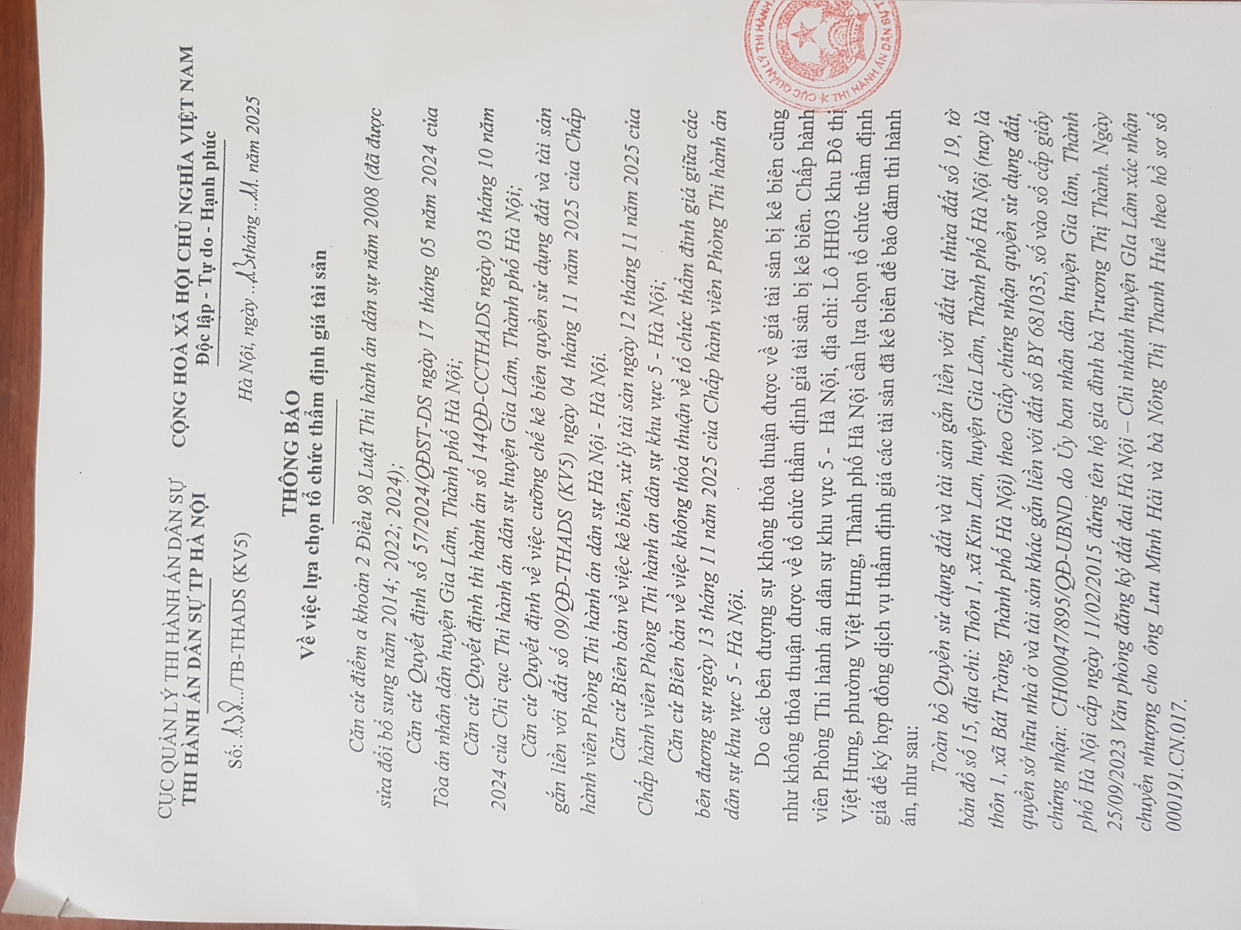 Thông báo số 632/TB-CCTHADS ngày 16/6/2021 của Chi cục THADS quận Thanh Xuân về việc lựa chọn tổ chức thẩm định giá