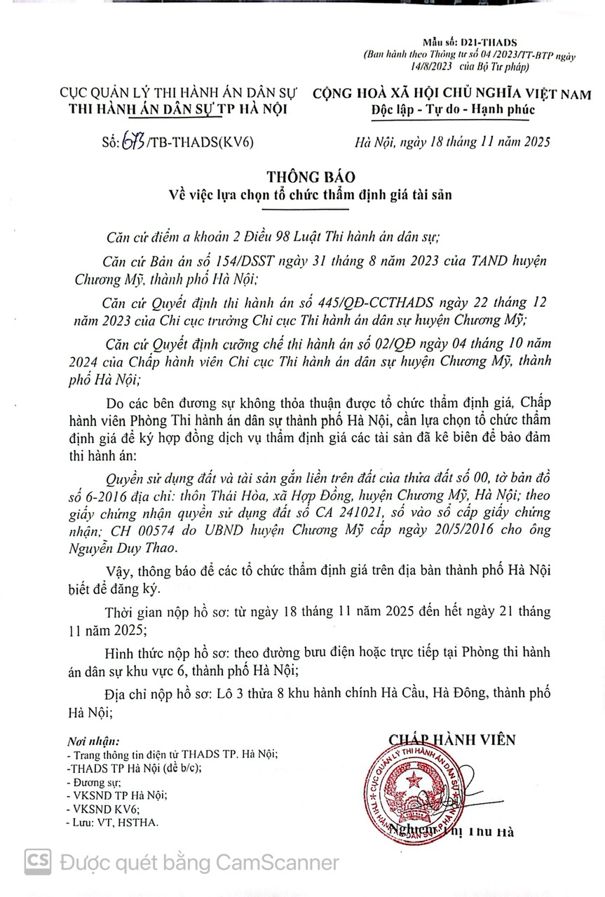 Thông báo số 632/TB-CCTHADS ngày 16/6/2021 của Chi cục THADS quận Thanh Xuân về việc lựa chọn tổ chức thẩm định giá