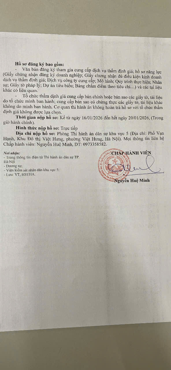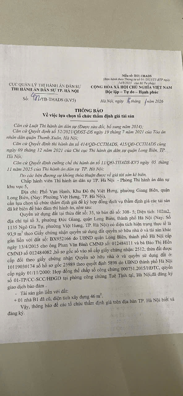 Phòng Thi hành án dân sự khu vực 5: Thông báo lựa chọn tổ chức thẩm định giá tài sản số 482/TB-THADS (KV5) ngày 16/01/2026