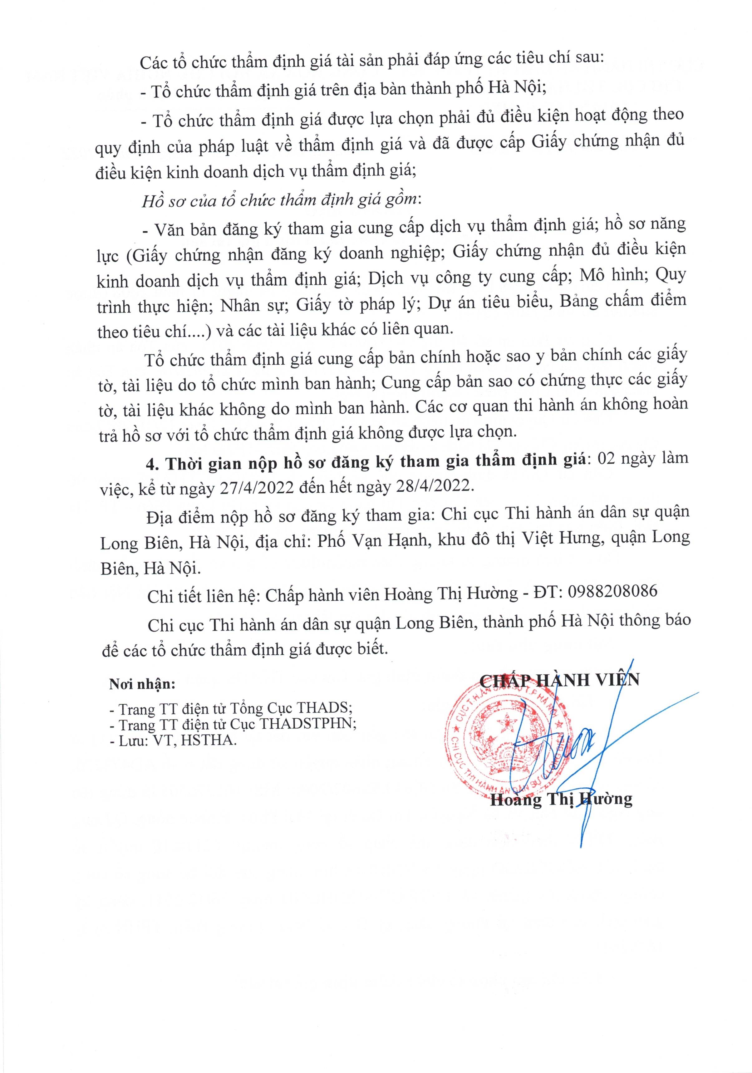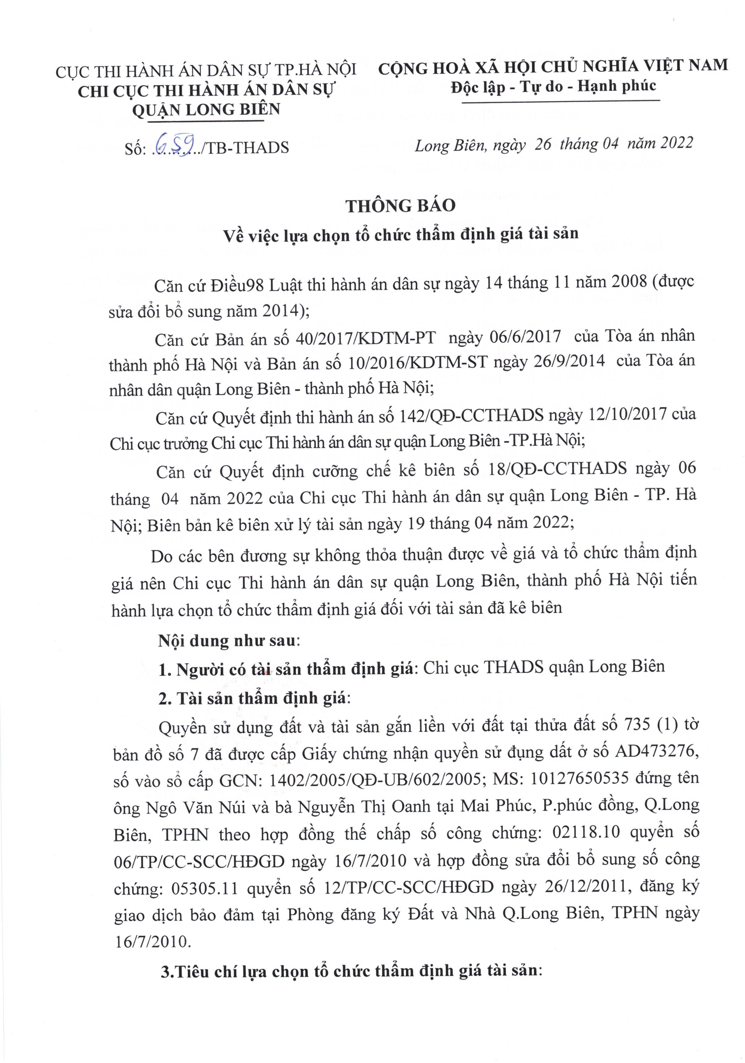 Chi cục THADS Long Biên Thông báo lựa chọn tổ chức Thẩm định giá tài sản số 659 TB-THADS ngày 26/4/2022