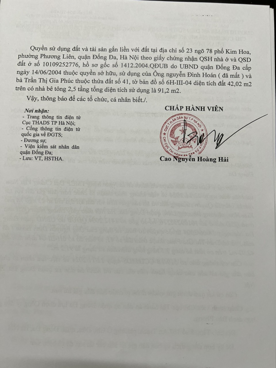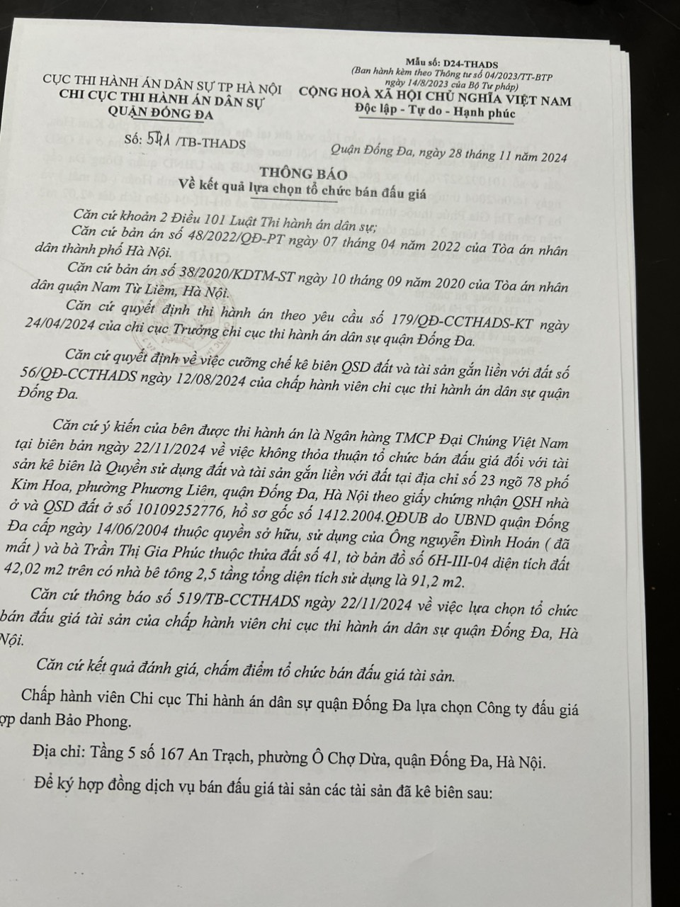 Chi cục THADS quận Đống Đa Thông báo số 541/TB-CCTHADS ngày 28/11/2024 về kết quả lựa chọn tổ chức bán đấu giá