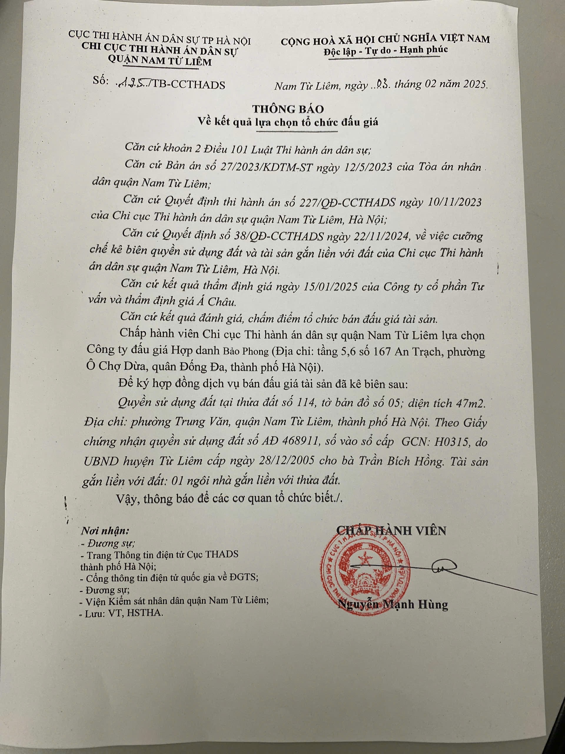 Thông báo 195/TB-CCTHADS ngày 03/2/2025 của Chi cục THADS quận Nam Từ Liêm về kết quả lựa chọn tổ chức bán đấu giá