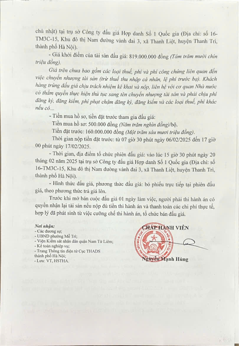 Thông báo 204/TB-CCTHADS ngày 07/02/2025 của CCTHADS quận Nam Từ Liêm về việc bán đấu giá tài sản