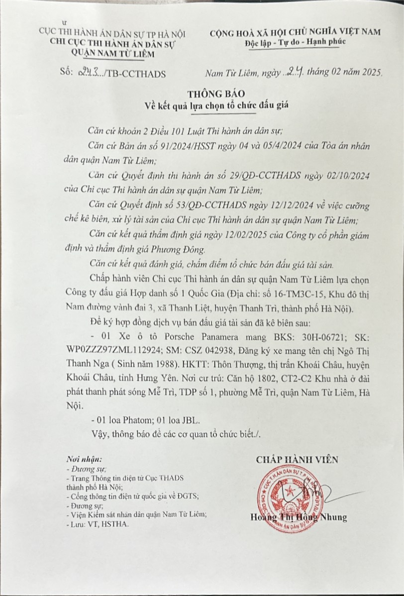 thông báo kết quả lựa chọn tổ chức đấu giá tài sản 243/TB-CCTHADS ngày 24/02/2025 của CCTHADS Nam Từ Liêm