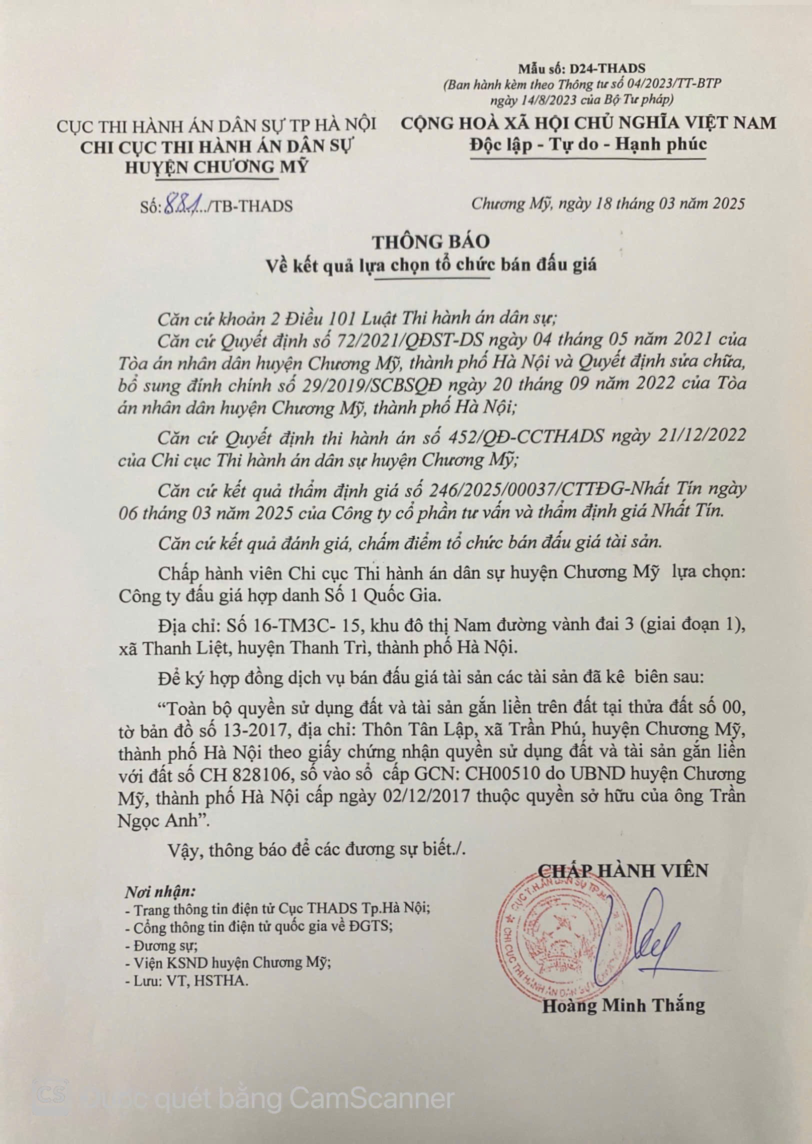TB số 881/TB - THADS ngày 18/3/2025 của Chi cục Thi hành án dân sự huyện Chương Mỹ về kết quả lựa chọn tổ chức BĐG tài sản