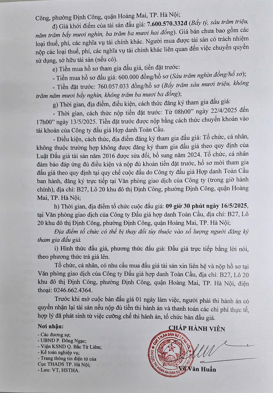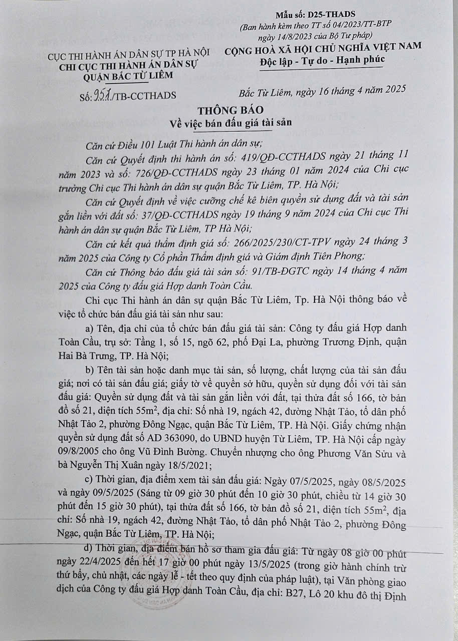 Chi cục THADS quận Bắc Từ Liêm Thông báo bán đấu giá tài sản số: 957/TB-CCTHADS ngày 16/4/2025