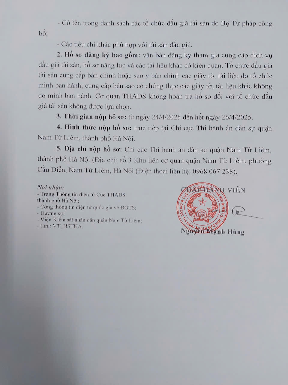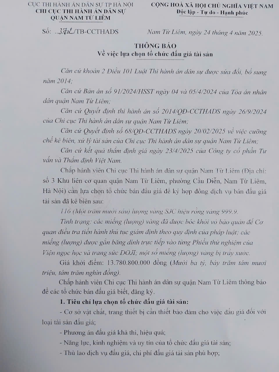 Thông báo 372/TB-CCTHADS ngày 24/4/2025 của Chi cục THADS quận Nam Từ Liêm