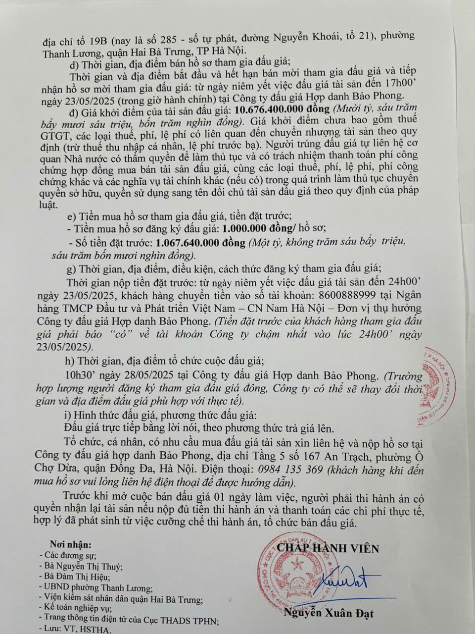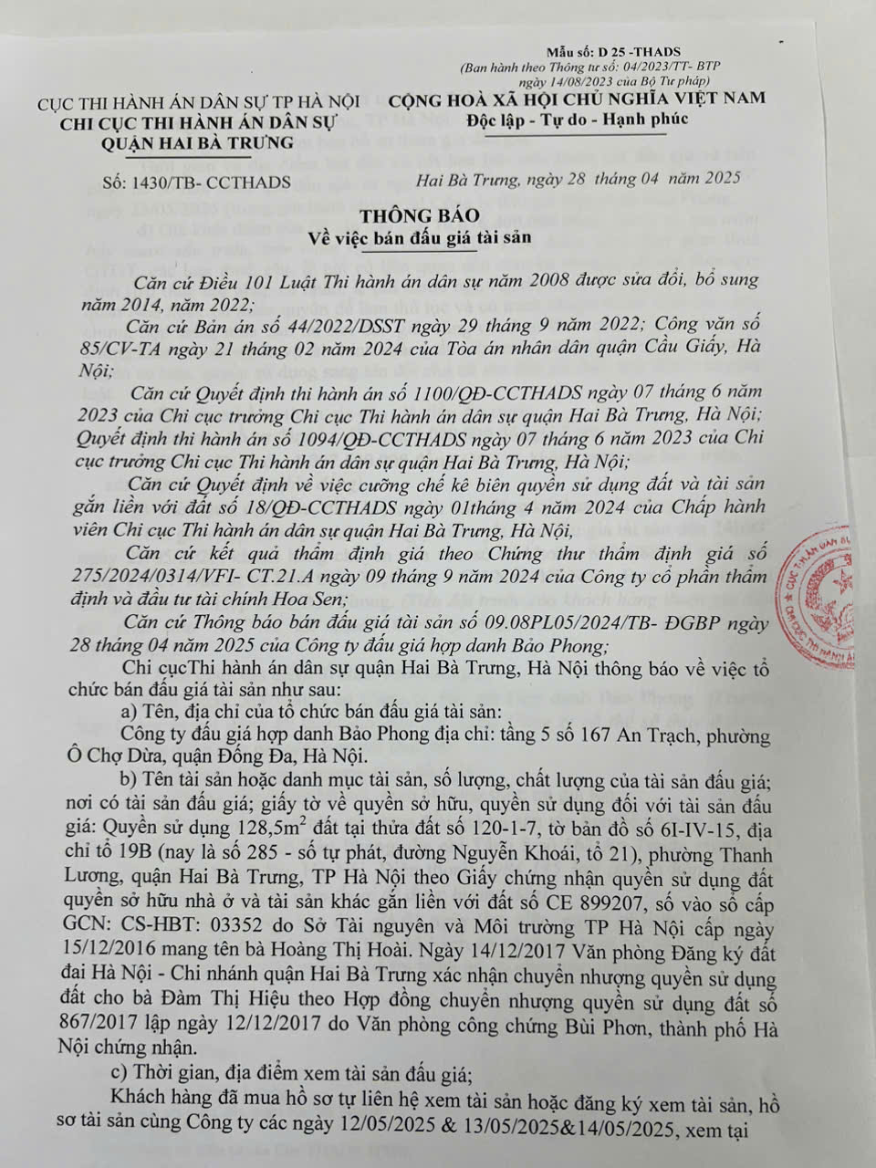 Chi cục Thi hành án dân sự quận Hai Bà Trưng thông báo bán đấu giá tài sản số 1430 ngày 28/4/2025