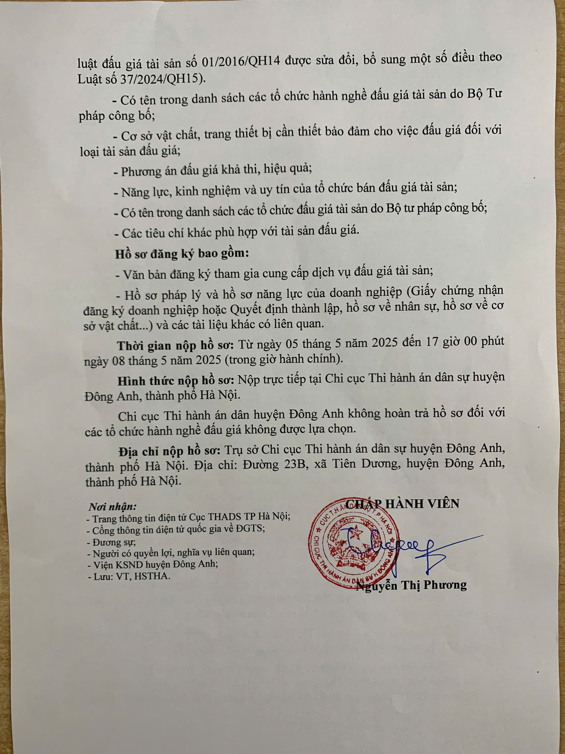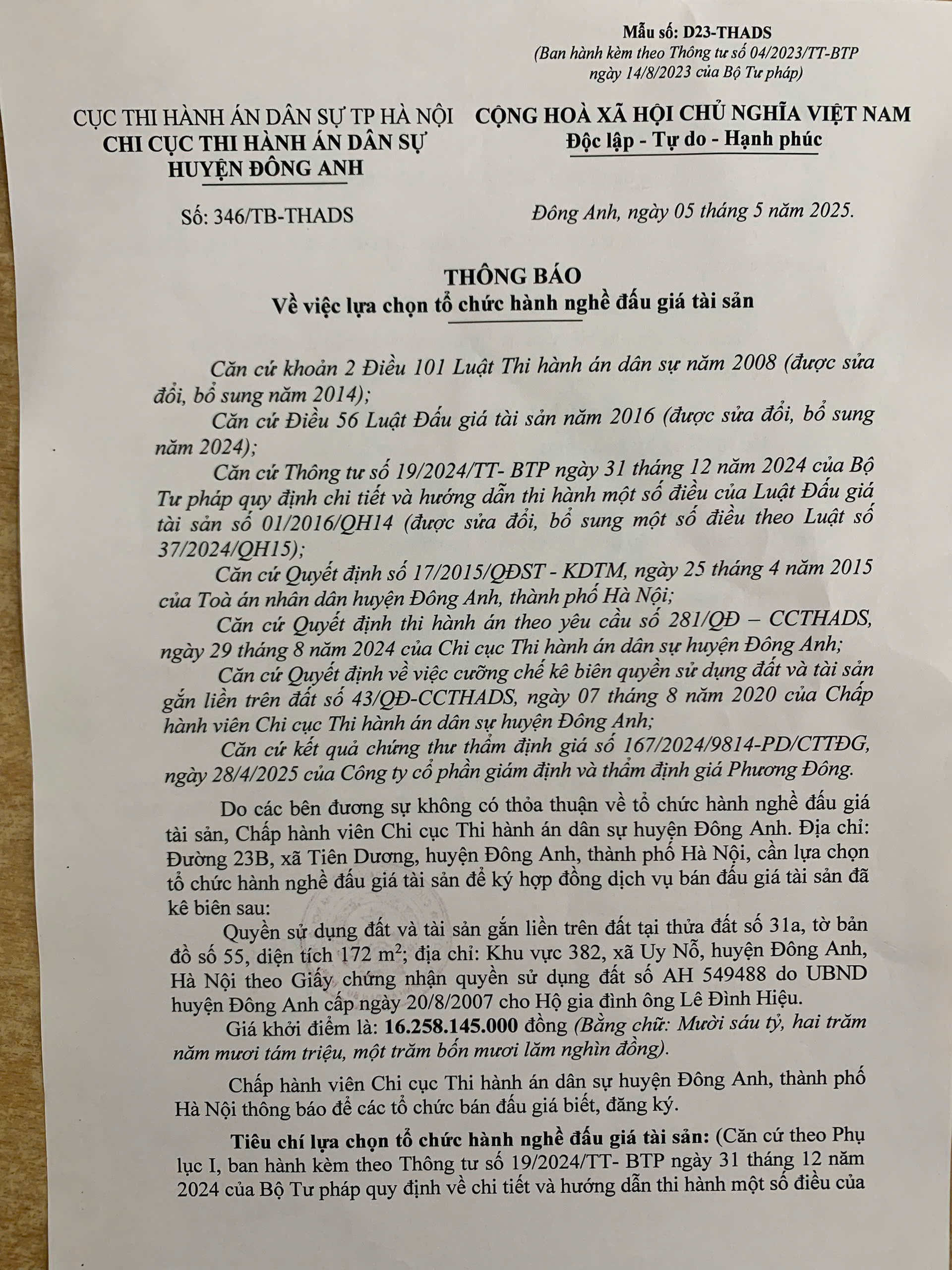 Chi cục Thi hành án dân sự huyện Đông Anh Thông báo về việc lựa chọn tổ chức hành nghề đấu giá tài sản số 346/TB-THADS ngày 05/5/2025