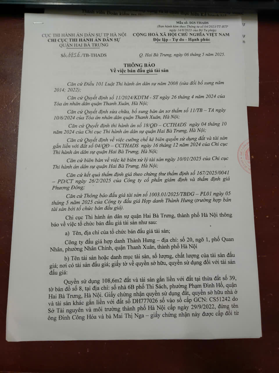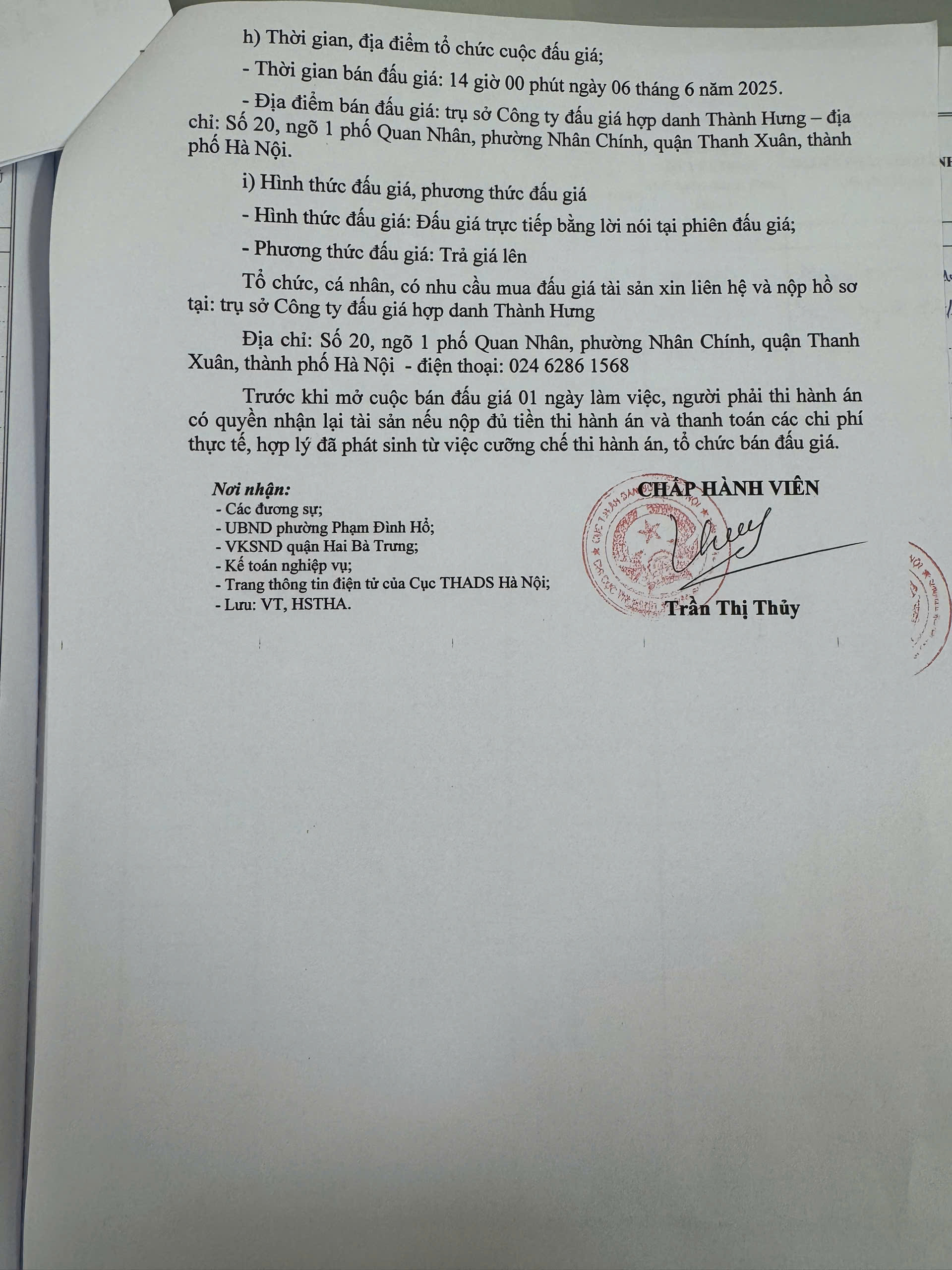 Chi cục Thi hành án dân sự quận Hai Bà Trưng thông báo bán đấu giá tài sản số 1456/TB - THADS ngày 06/5/2025