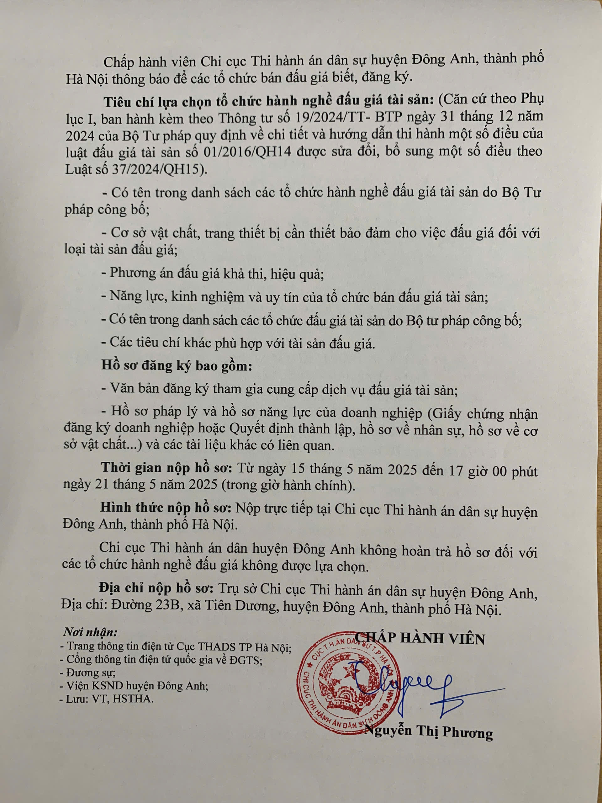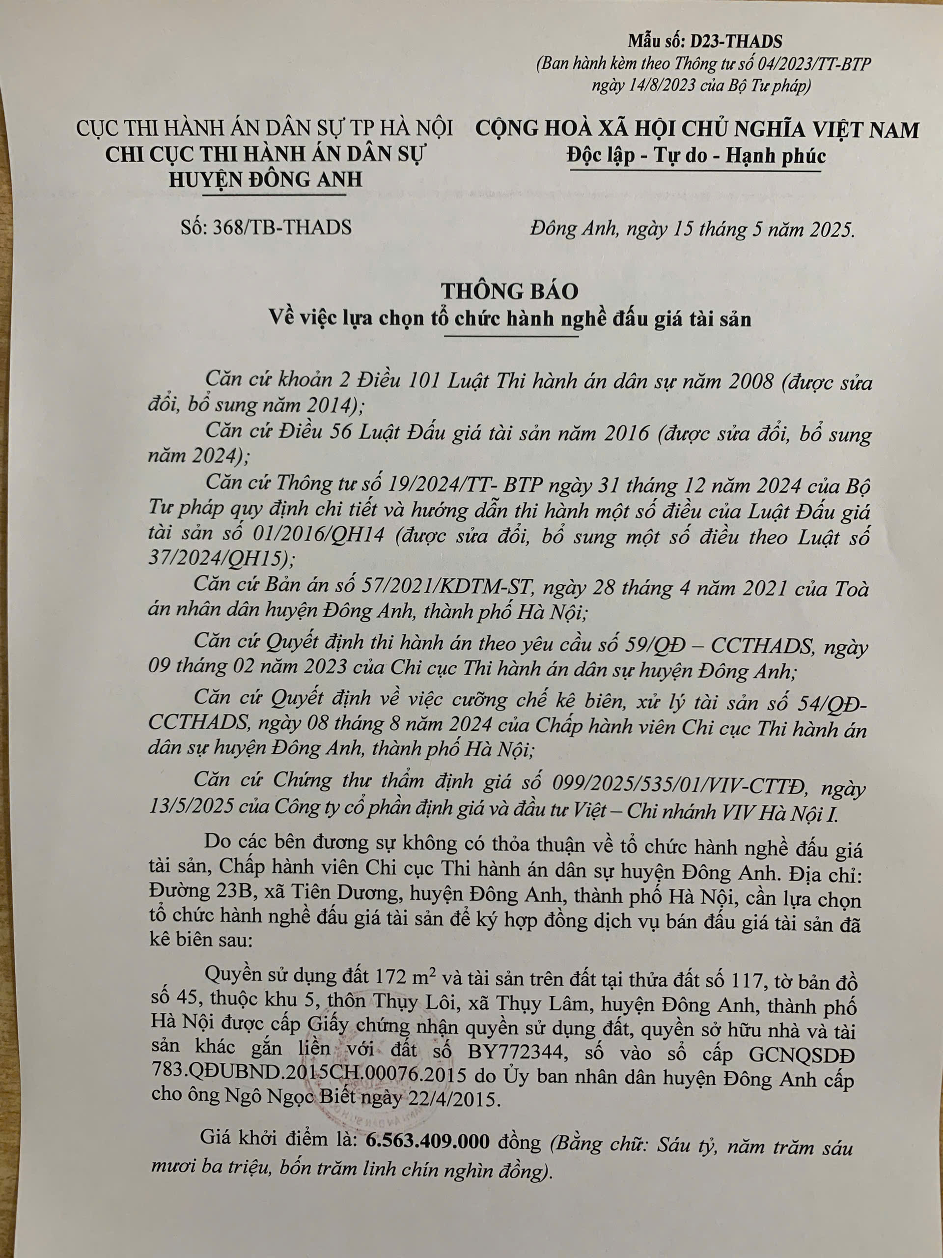 Chi cục Thi hành án dân sự huyện Đông Anh Thông báo về việc lựa chọn tổ chức hành nghề đấu giá tài sản số 368/TB-THADS ngày 15/5/2025