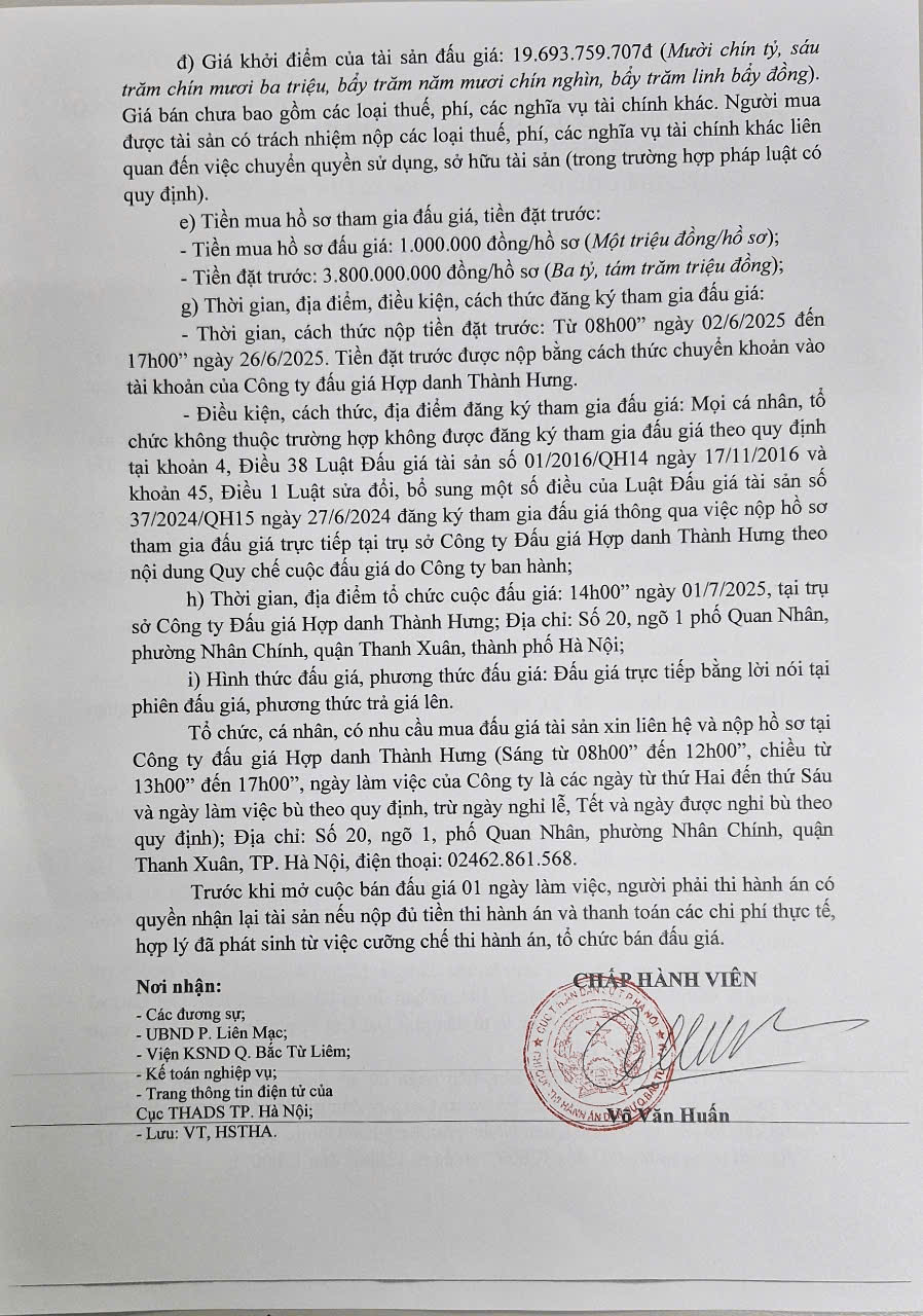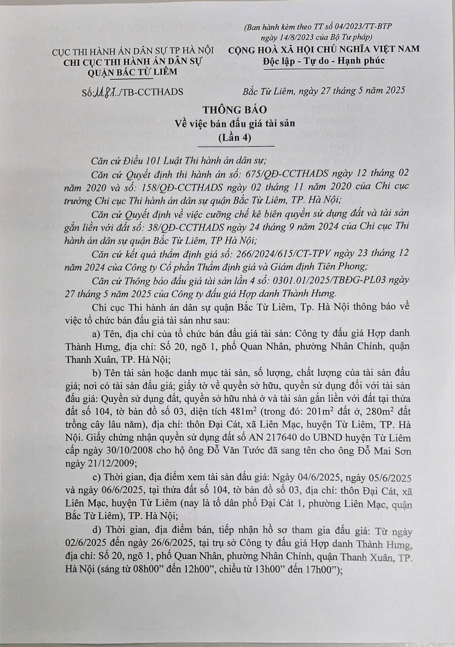 Chi cục THADS quận Bắc Từ Liêm Thông báo bán đấu giá tài sản số: 1187/TB-CCTHADS ngày 27/5/2025