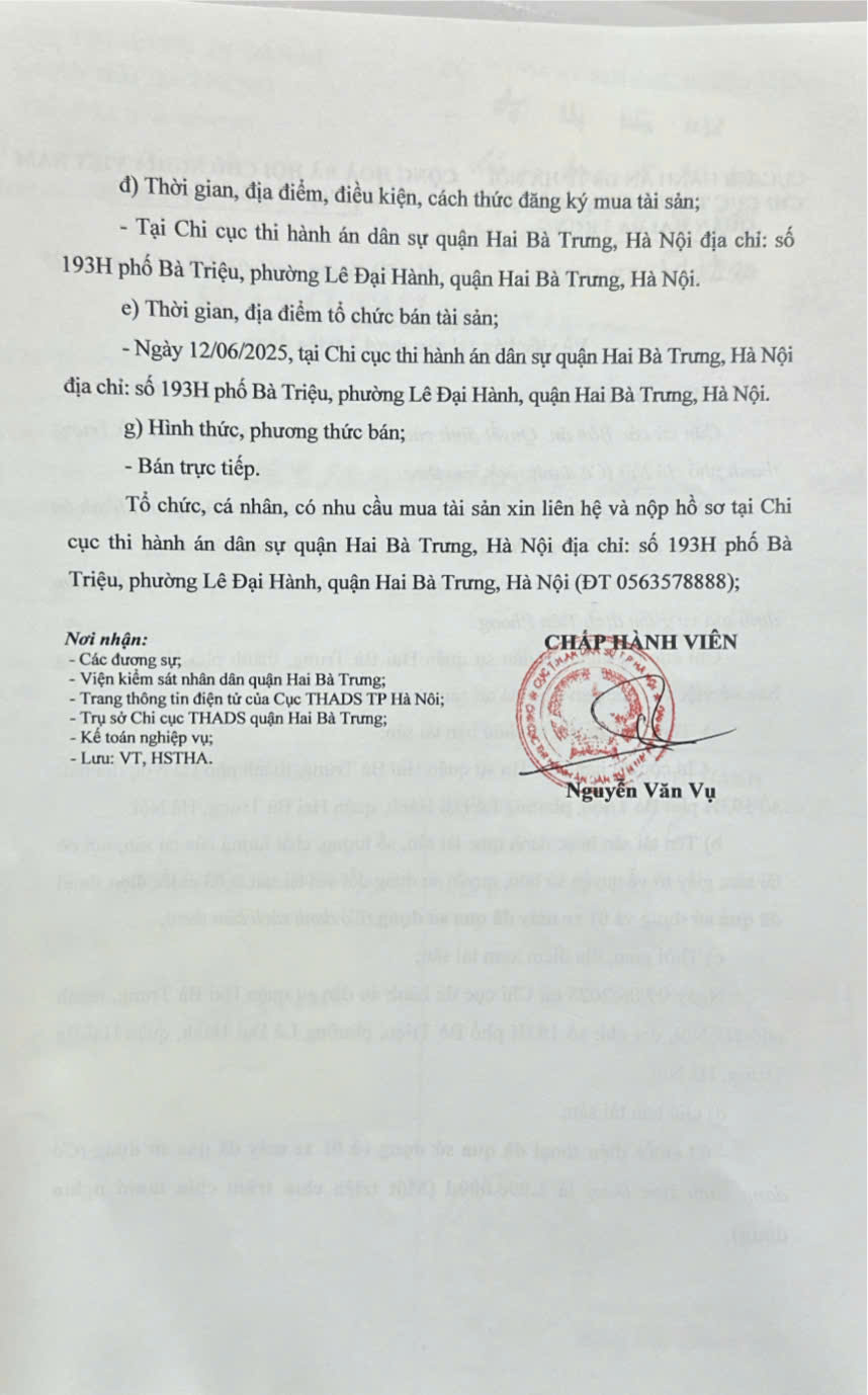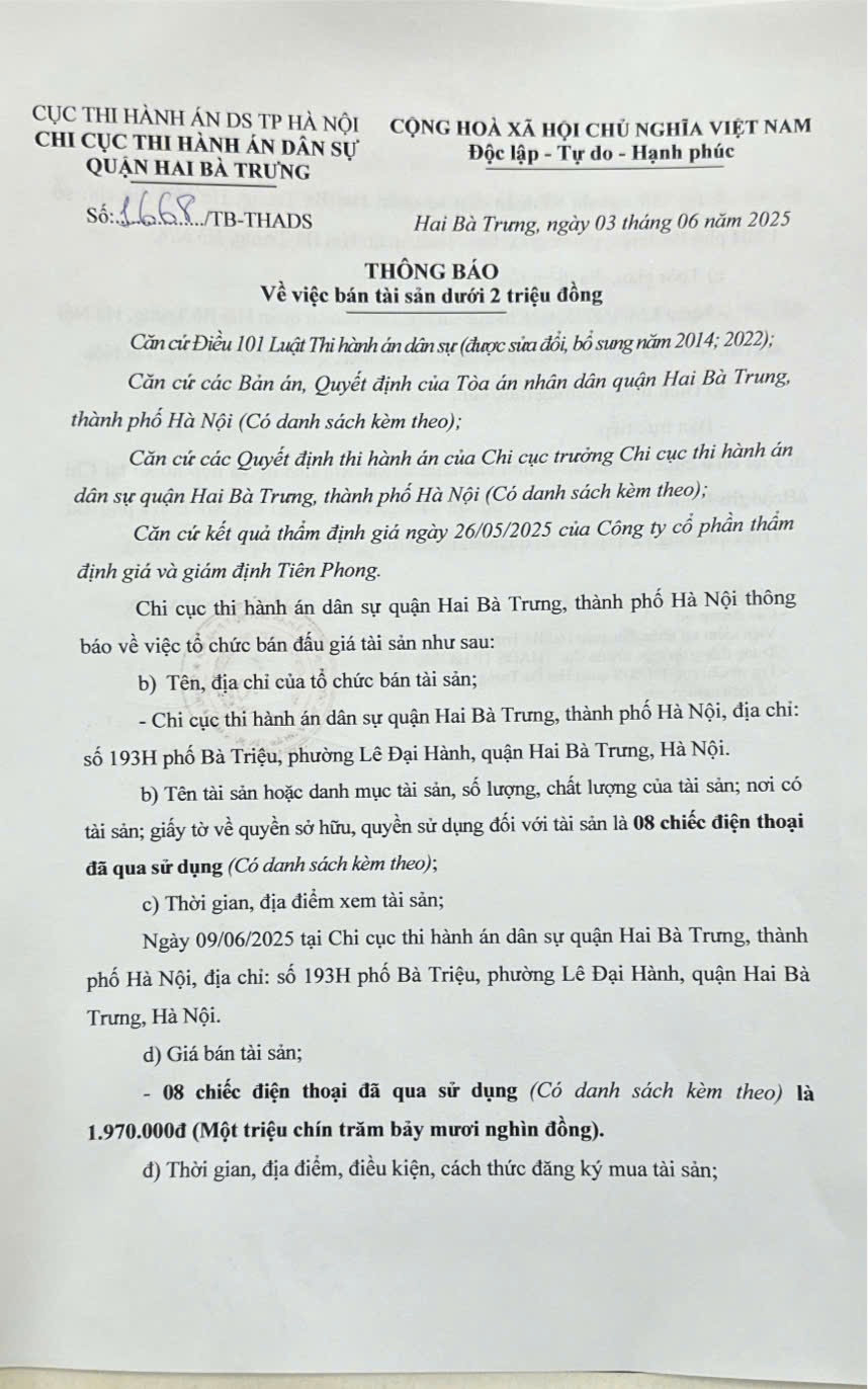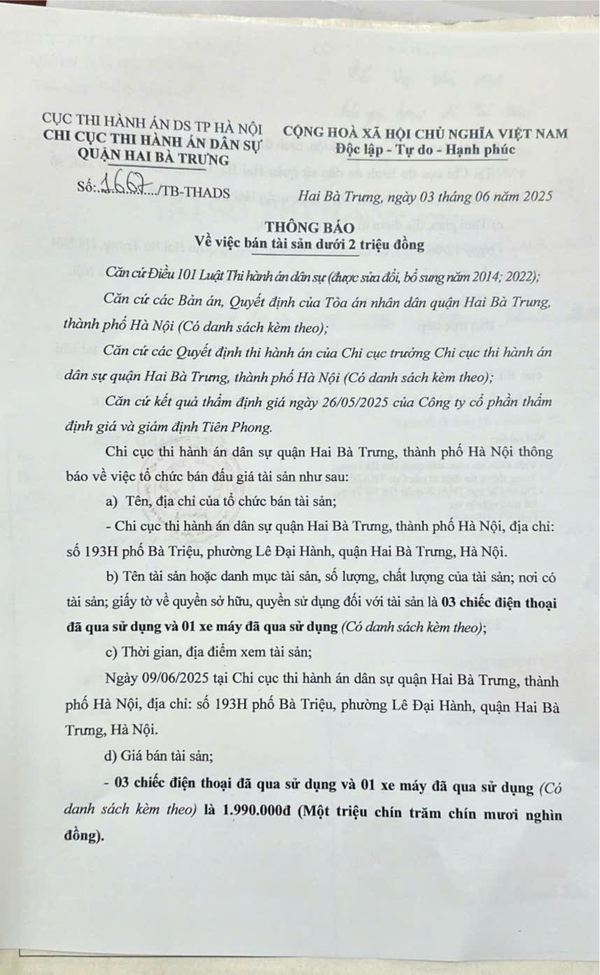 Chi cục Thi hành án dân sự quận Hai Bà Trưng Thông bao về việc bán đấu giá tài sản dưới 2 triệu đồng số 1667, 1668/TB-CCTHADS ngày 03/06/2025