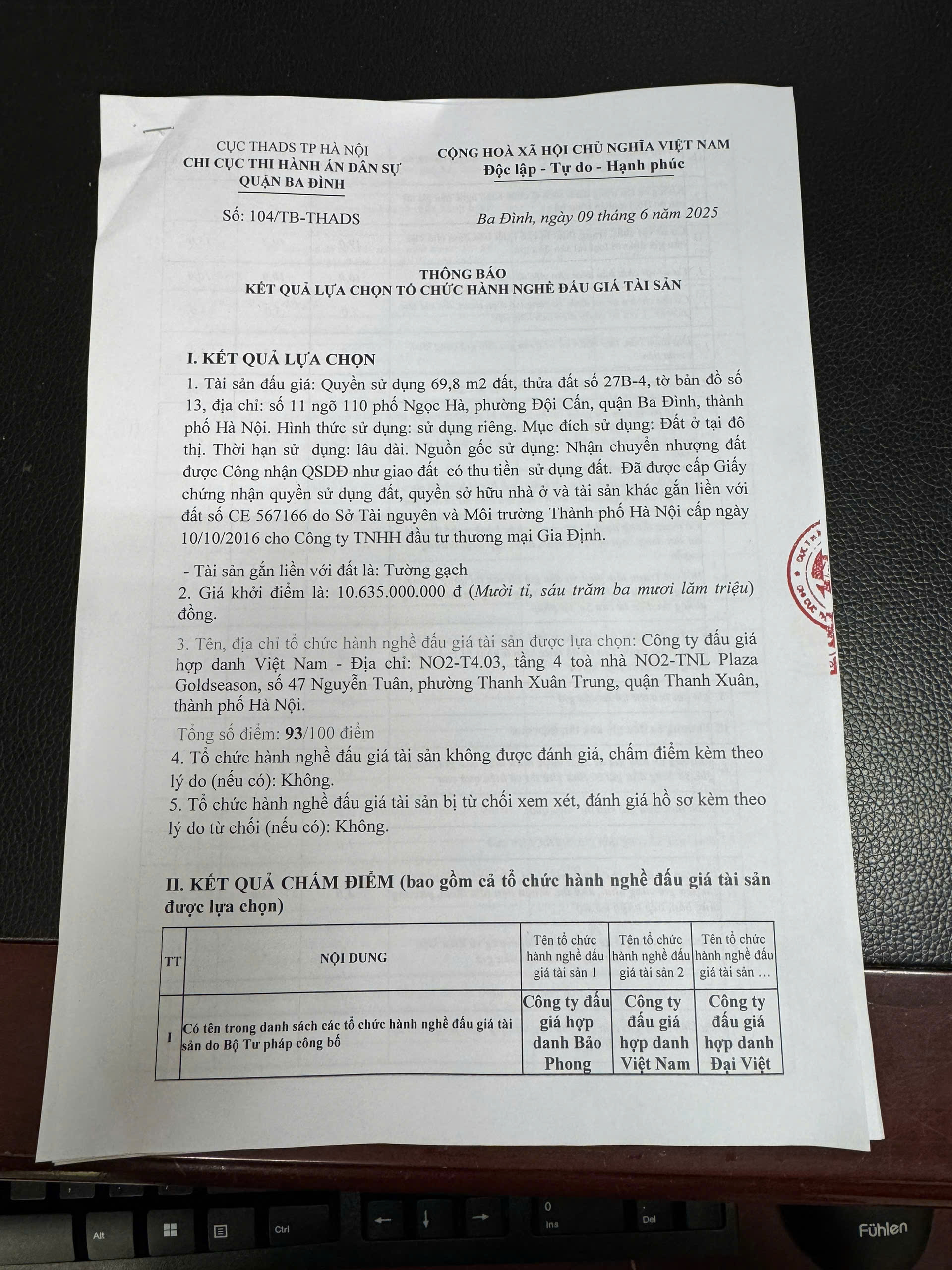 Chi cục THADS Quận Ba Đình đăng kết quả lựa chọn tổ chức bán đấu giá số 103 104 ngày 09/6/2025