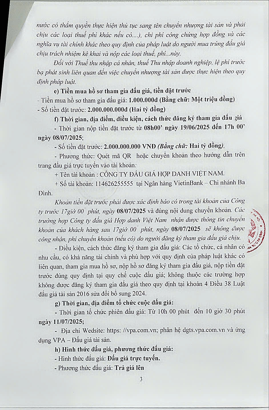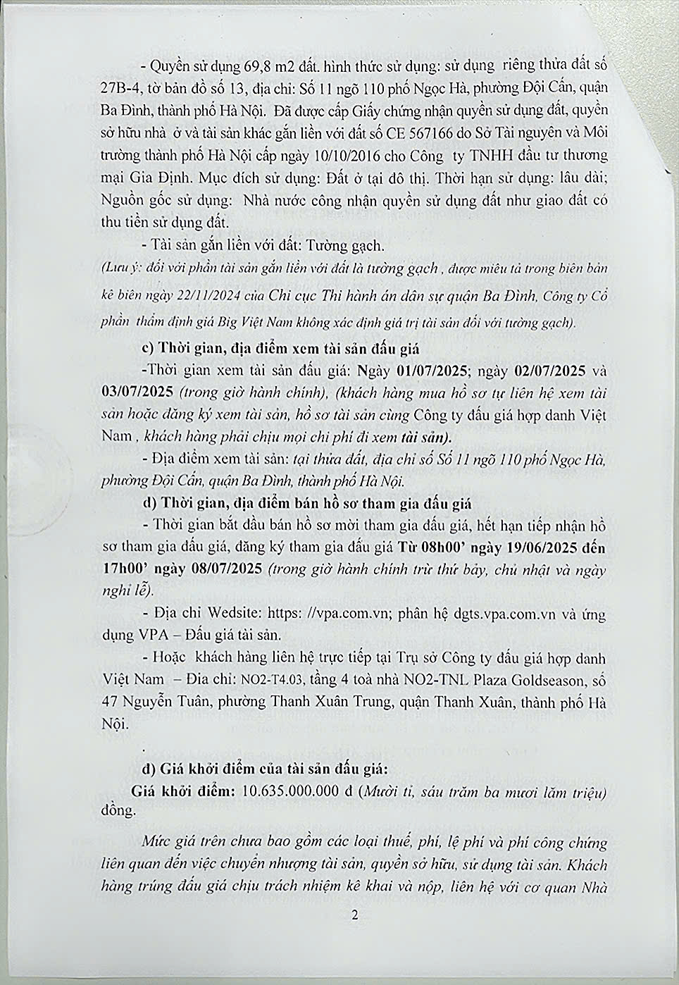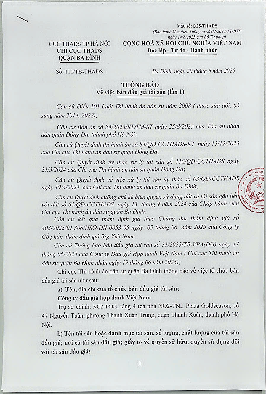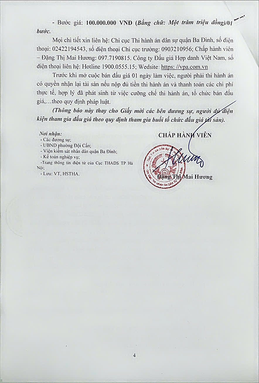Chi cục THADS quận Ba Đình, TP Hà Nội thông báo v/v bán đấu giá tài sản số 111/TB-THADS ngày 20/6/2025