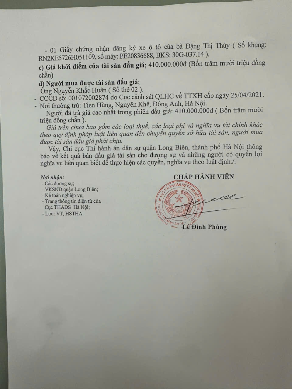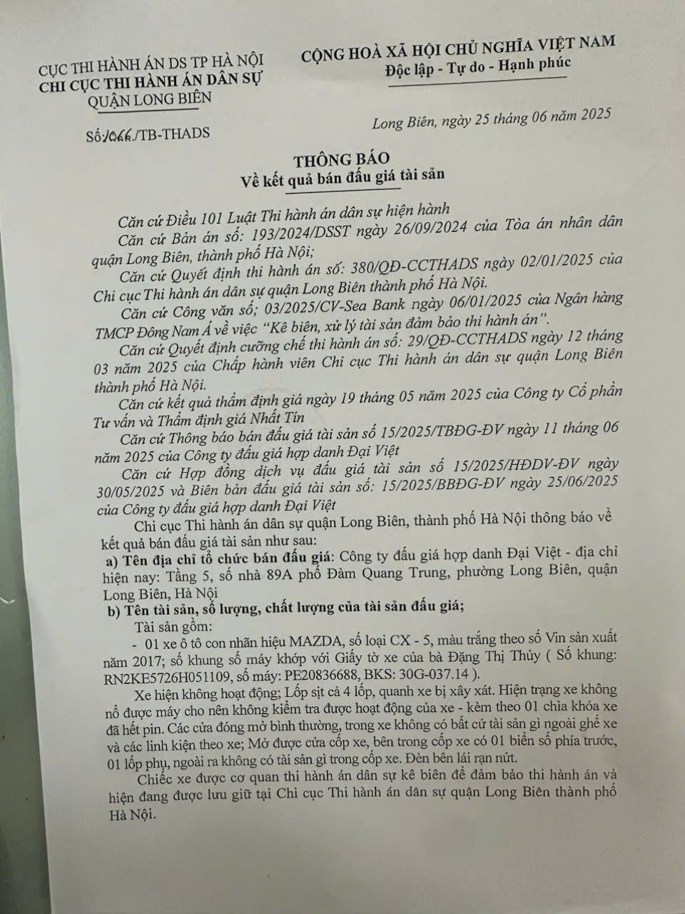Chi cục Thi hành án dân sự quận Long Biên, thông báo kết quả bán đấu giá tài sản số 1066/TB-CCTHADS ngày 25/6/2025